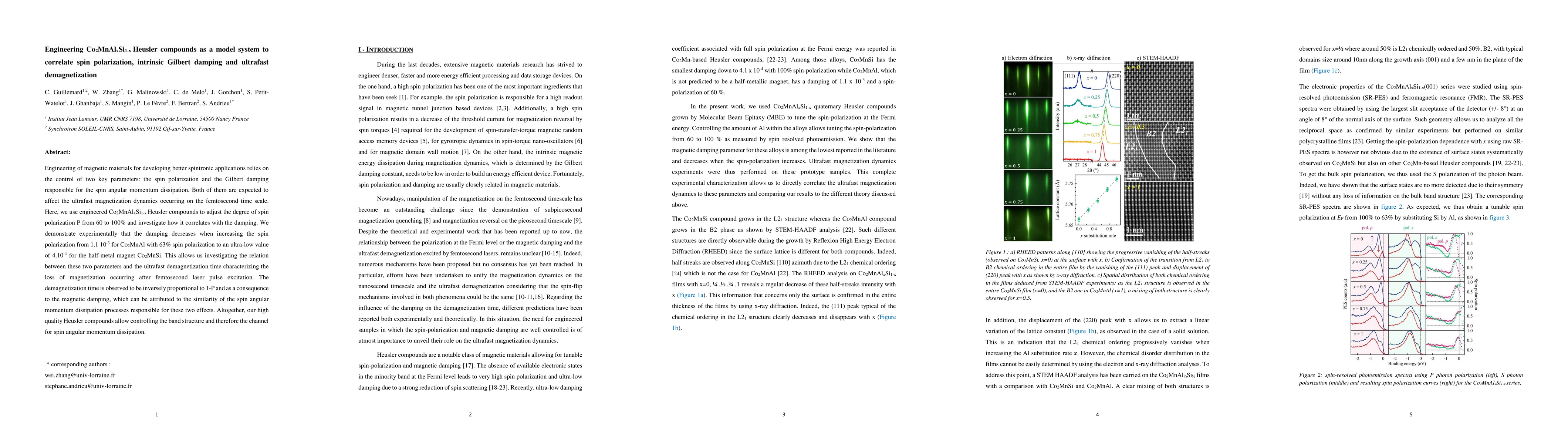 This paper investigates engineered Co$_2$MnAl$_x$Si$_{1-x}$ Heusler compounds to correlate spin polarization and intrinsic Gilbert damping, demonstrating that higher spin polarization reduces damping and correlates inversely with ultrafast demagnetization time. The findings suggest a direct relationship between spin angular momentum dissipation and magnetic damping.