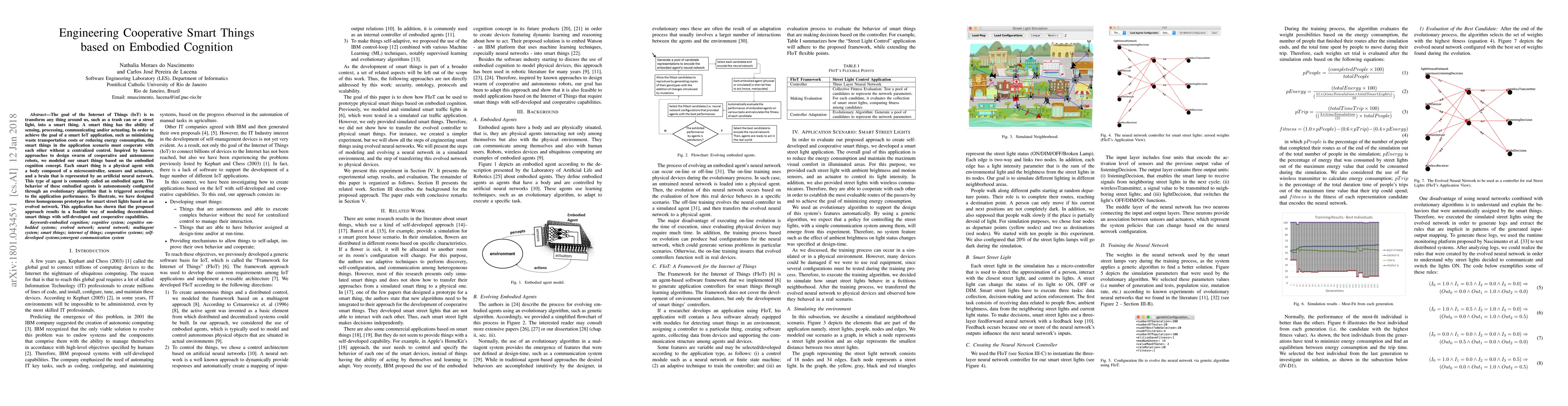 The goal of the Internet of Things (IoT) is to transform any thing around us, such as a trash can or a street light, into a smart thing. A smart thing has the ability of sensing, processing, communicating and/or actuating. In order to achieve the goal of a smart IoT application, such as minimizing waste transportation costs or reducing energy consumption, the smart things in the application scenario must cooperate with each other without a centralized control. Inspired by known approaches to design swarm of cooperative and autonomous robots, we modeled our smart things based on the embodied cognition concept. Each smart thing is a physical agent with a body composed of a microcontroller, sensors and actuators, and a brain that is represented by an artificial neural network. This type of agent is commonly called an embodied agent. The behavior of these embodied agents is autonomously configured through an evolutionary algorithm that is triggered according to the application performance. To illustrate, we have designed three homogeneous prototypes for smart street lights based on an evolved network. This application has shown that the proposed approach results in a feasible way of modeling decentralized smart things with self-developed and cooperative capabilities.