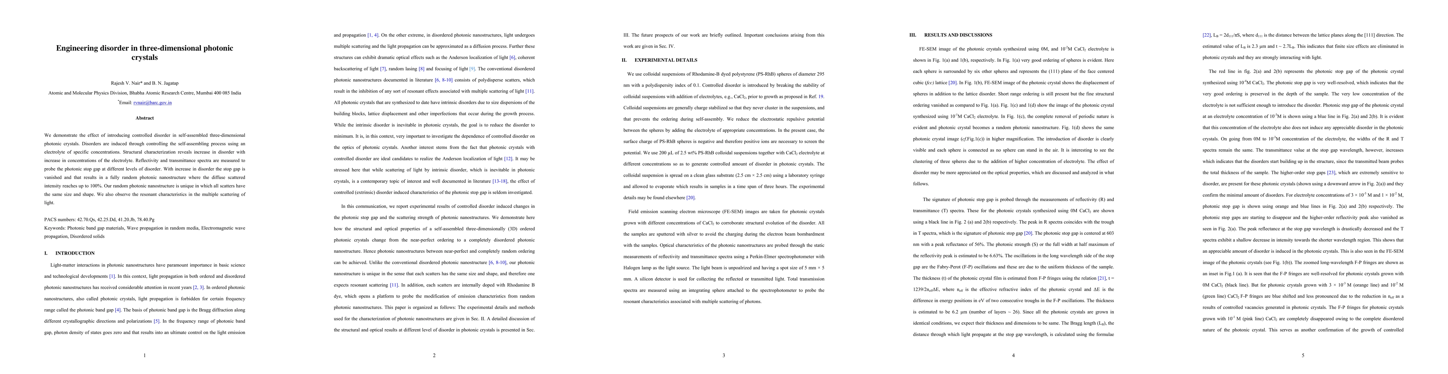This study introduces controlled disorder into self-assembled three-dimensional photonic crystals using electrolytes, leading to a complete loss of the photonic stop gap and 100% diffuse scattering, while maintaining uniform scatterer sizes and shapes, and demonstrating resonant light scattering.