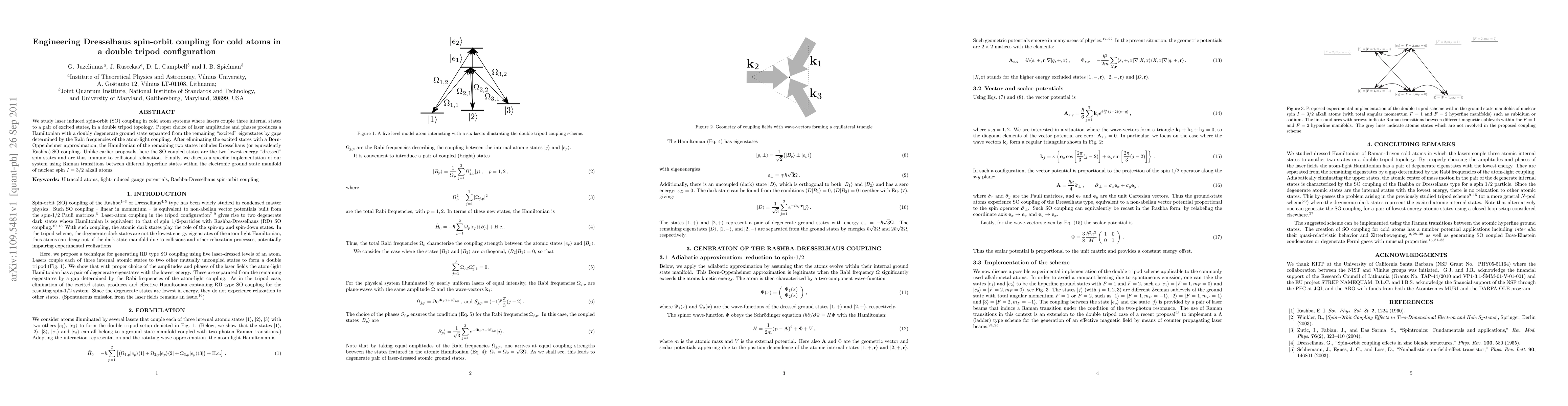 This paper explores laser-induced spin-orbit coupling in cold atoms arranged in a double tripod configuration, resulting in a Hamiltonian featuring Dresselhaus spin-orbit coupling in the two lowest energy states, which are protected from collisional relaxation. The study proposes a practical implementation using Raman transitions in alkali atoms with nuclear spin I = 3/2.