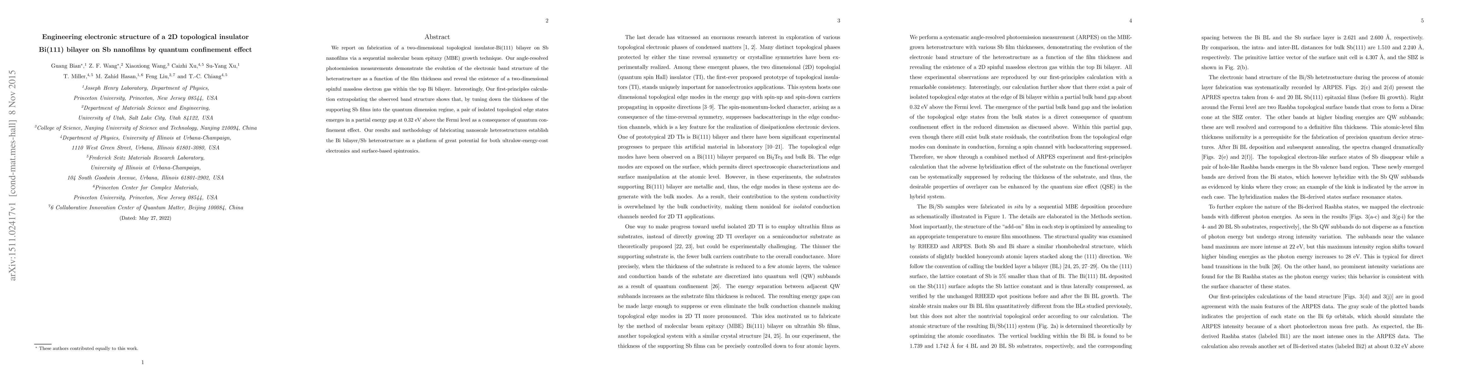 This paper details the fabrication of a two-dimensional topological insulator Bi(111) bilayer on Sb nanofilms using MBE, revealing a quantum-confinement-induced pair of topological edge states. The study highlights the potential of this heterostructure for low-energy electronics and spintronics.