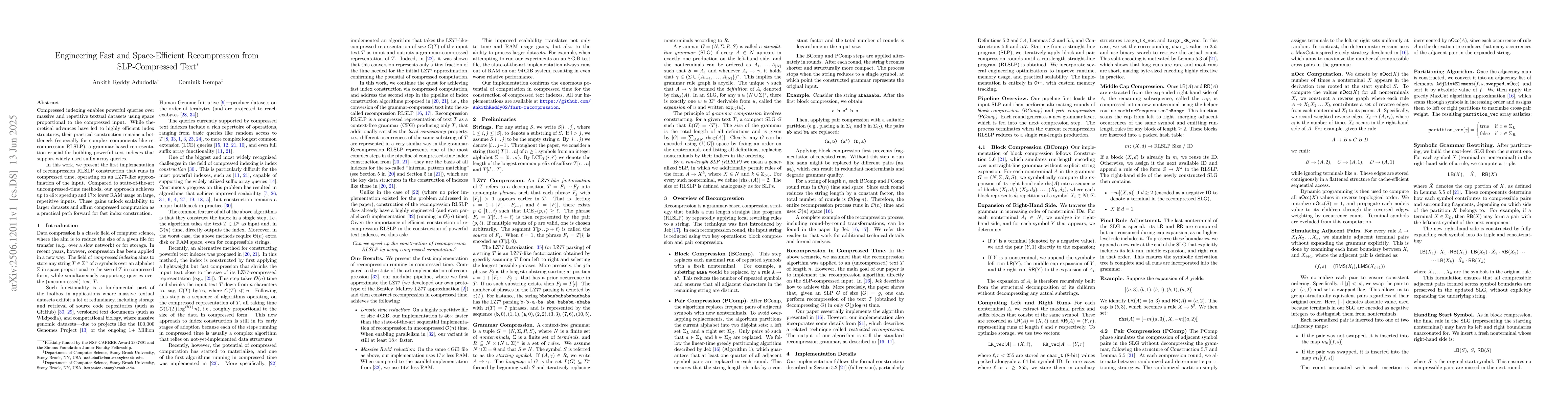 This research introduces an efficient implementation for constructing recompression RLSLP, a grammar-based representation crucial for text indexing. The method achieves up to 46x speedup and 17x lower RAM usage compared to existing techniques, enabling faster and more space-efficient processing of large, repetitive text datasets.