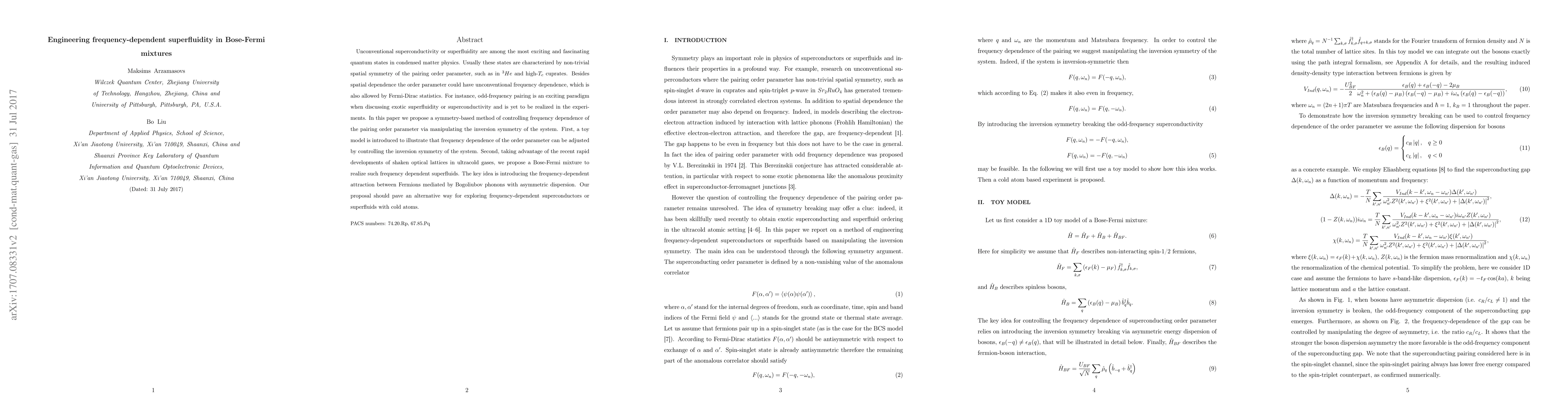 This paper proposes a method to engineer frequency-dependent superfluidity in Bose-Fermi mixtures by manipulating the inversion symmetry of the system. It introduces a toy model and suggests using Bose-Fermi mixtures in shaken optical lattices to realize such frequency-dependent superfluids, mediated by asymmetric Bogoliubov phonons.