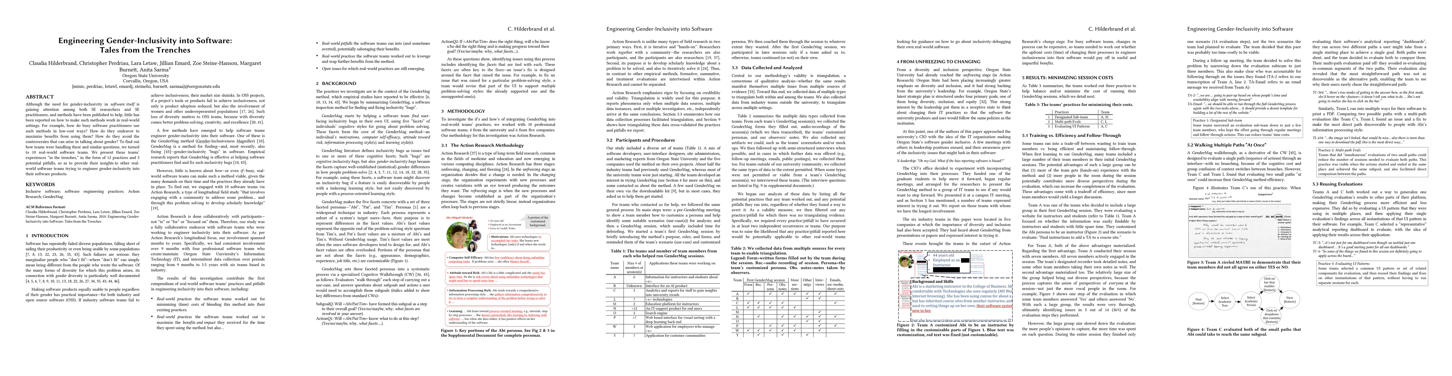 Although the need for gender-inclusivity in software itself is gaining attention among both SE researchers and SE practitioners, and methods have been published to help, little has been reported on how to make such methods work in real-world settings. For example, how do busy software practitioners use such methods in low-cost ways? How do they endeavor to maximize benefits from using them? How do they avoid the controversies that can arise in talking about gender? To find out how teams were handling these and similar questions, we turned to 10 real-world software teams. We present these teams experiences "in the trenches," in the form of 12 practices and 3 potential pitfalls, so as to provide their insights to other real-world software teams trying to engineer gender-inclusivity into their software products.