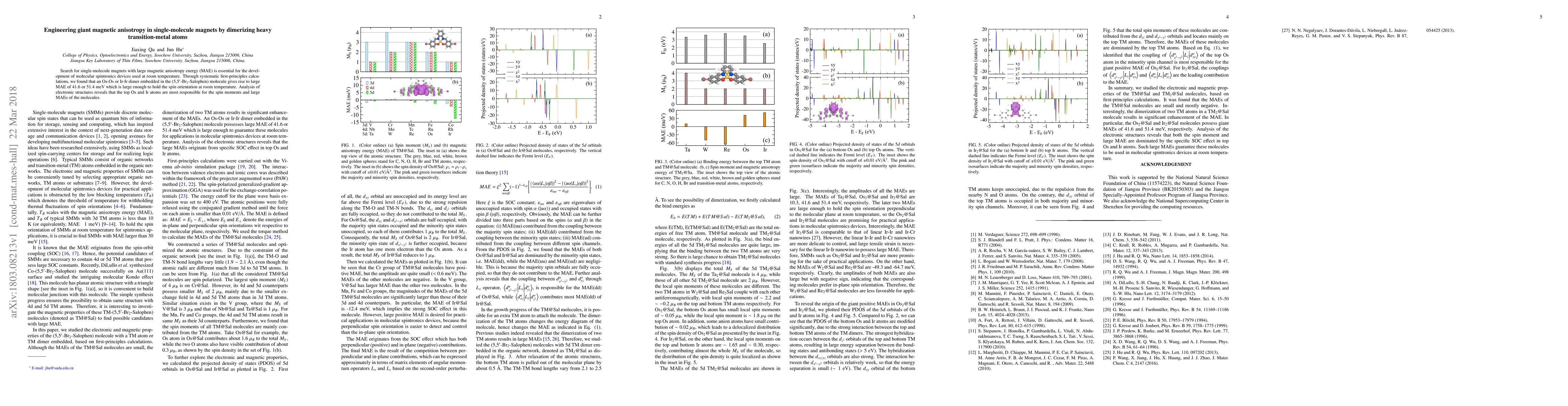 The paper presents a method to engineer giant magnetic anisotropy in single-molecule magnets by dimerizing heavy transition-metal atoms within a specific organic network, providing a theoretical foundation for molecular spintronics devices.
