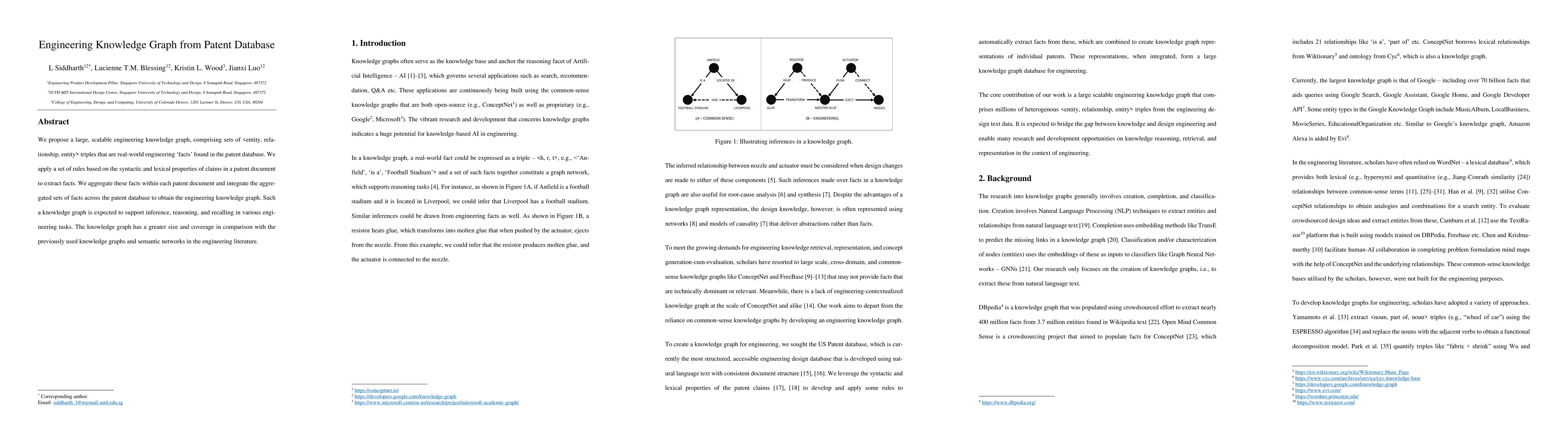 We propose a large, scalable engineering knowledge graph, comprising sets of (entity, relationship, entity) triples that are real-world engineering facts found in the patent database. We apply a set of rules based on the syntactic and lexical properties of claims in a patent document to extract facts. We aggregate these facts within each patent document and integrate the aggregated sets of facts across the patent database to obtain the engineering knowledge graph. Such a knowledge graph is expected to support inference, reasoning, and recalling in various engineering tasks. The knowledge graph has a greater size and coverage in comparison with the previously used knowledge graphs and semantic networks in the engineering literature.