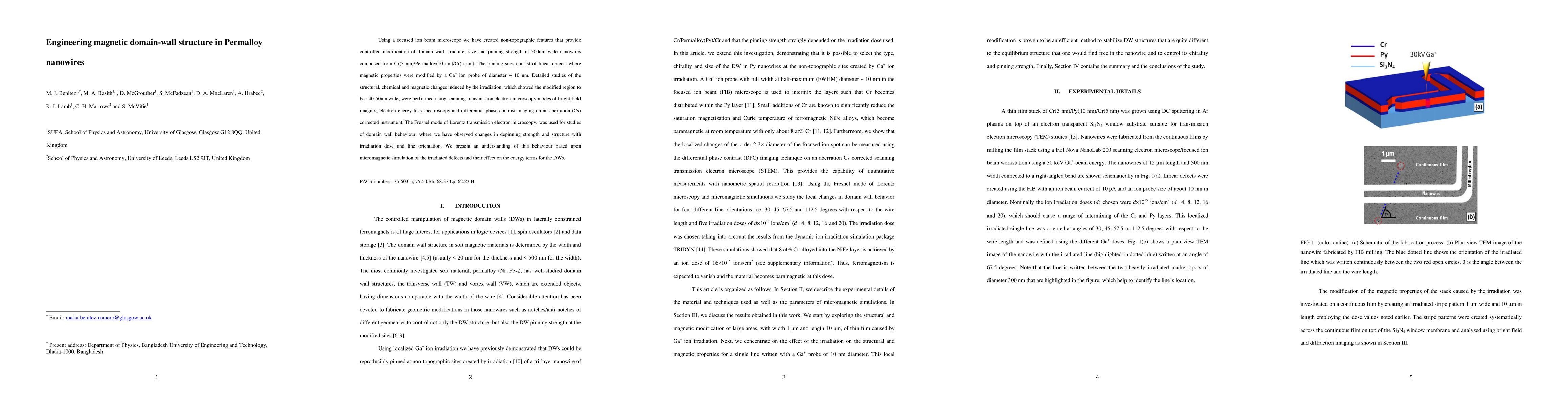 This study investigates the manipulation of magnetic domain walls in permalloy nanowires by using focused ion beam-induced Ga ion irradiation to create pinning sites for domain walls. The research demonstrates that despite a small ion probe size, the modified region spans 40-50 nm and reveals control over domain wall structure and depinning strength through irradiation dose and line orientation.