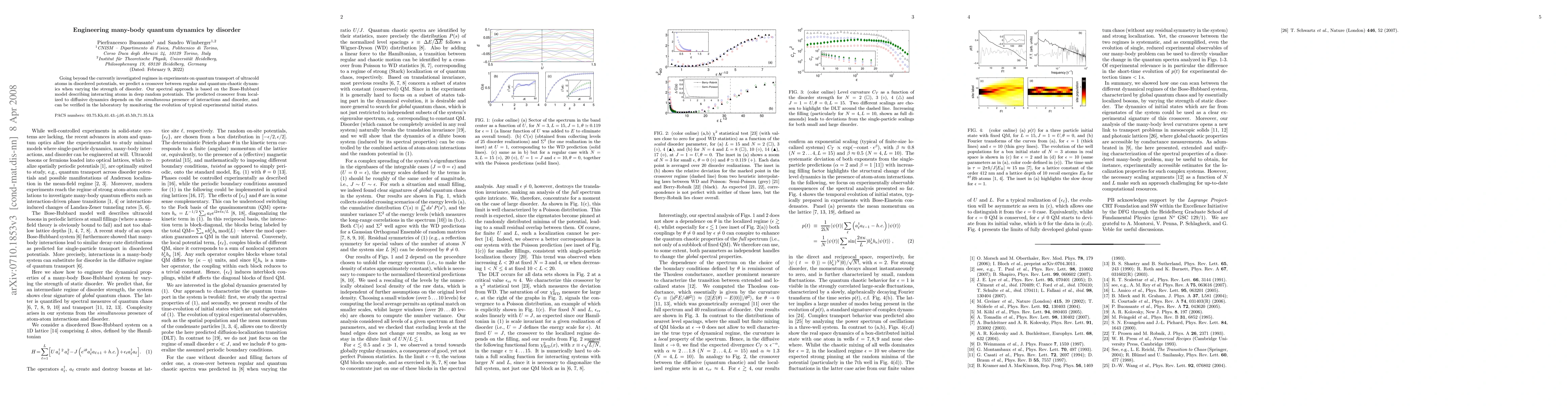 Going beyond the currently investigated regimes in experiments on quantum transport of ultracold atoms in disordered potentials, we predict a crossover between regular and quantum-chaotic dynamics when varying the strength of disorder. Our spectral approach is based on the Bose-Hubbard model describing interacting atoms in deep random potentials. The predicted crossover from localized to diffusive dynamics depends on the simultaneous presence of interactions and disorder, and can be verified in the laboratory by monitoring the evolution of typical experimental initial states.