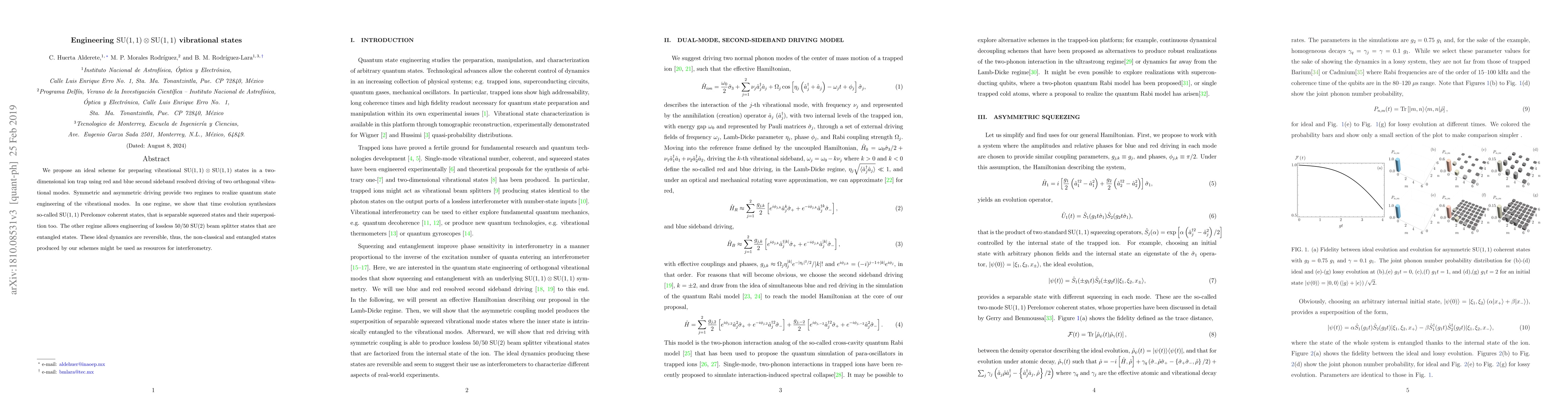 The paper proposes a scheme to prepare $\mathrm{SU(1,1) \otimes SU(1,1)}$ vibrational states in a two-dimensional ion trap, utilizing resolved sideband driving. It enables the synthesis of $\mathrm{SU}(1,1)$ coherent states and lossless $\mathrm{SU}(2)$ beam splitter entangled states, which could serve as resources for interferometry.