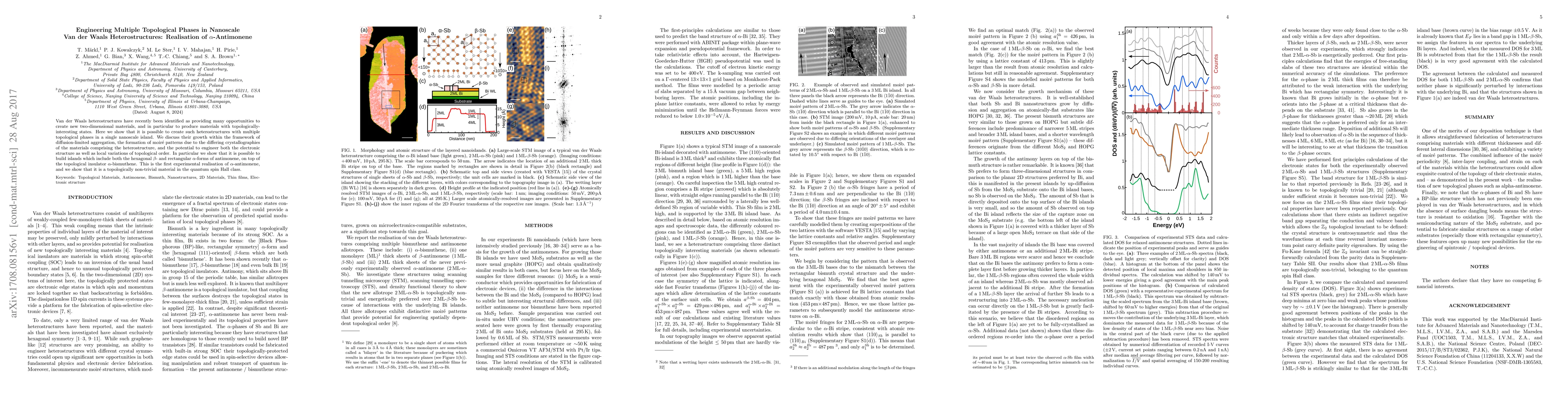 Van der Waals heterostructures have recently been identified as providing many opportunities to create new two-dimensional materials, and in particular to produce materials with topologically interesting states. Here we show that it is possible to create such heterostructures with multiple topological phases in a single nanoscale island. We discuss their growth within the framework of diffusion-limited aggregation, the formation of moir\'e patterns due to the differing crystallographies of the materials comprising the heterostructure, and the potential to engineer both the electronic structure as well as local variations of topological order. In particular we show that it is possible to build islands which include both the hexagonal $\beta$- and rectangular $\alpha$-forms of antimonene, on top of the topological insulator $\alpha$-bismuthene. This is the first experimental realisation of $\alpha$-antimonene, and we show that it is a topologically non-trivial material in the quantum spin Hall class.