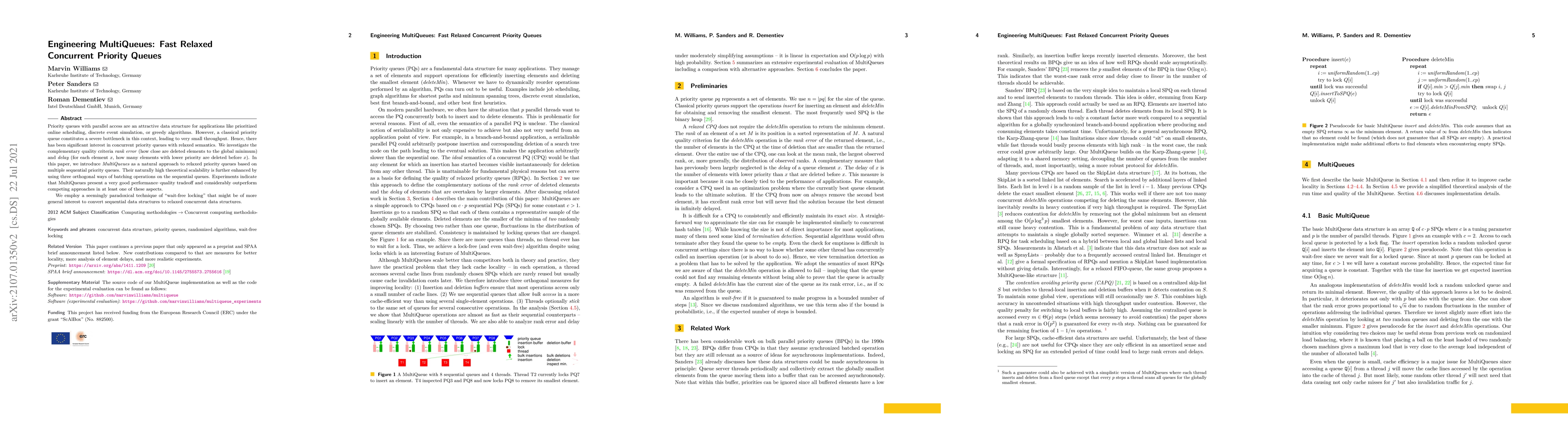 This paper introduces MultiQueues, a fast relaxed concurrent priority queue that enhances throughput for parallel applications by using multiple sequential priority queues and batching operations. The technique of "wait-free locking" is employed to convert these structures, achieving a favorable performance-quality tradeoff and outperforming existing methods.