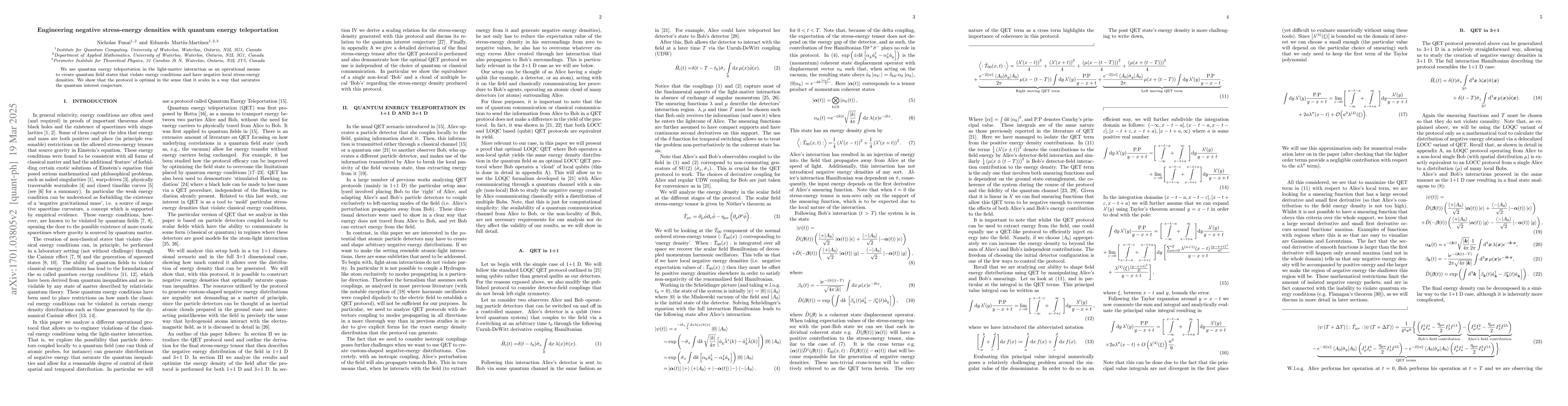 Summary: This paper demonstrates the use of quantum energy teleportation to create quantum field states that violate energy conditions and possess negative local stress-energy densities, achieving optimal scaling that aligns with the quantum interest conjecture.