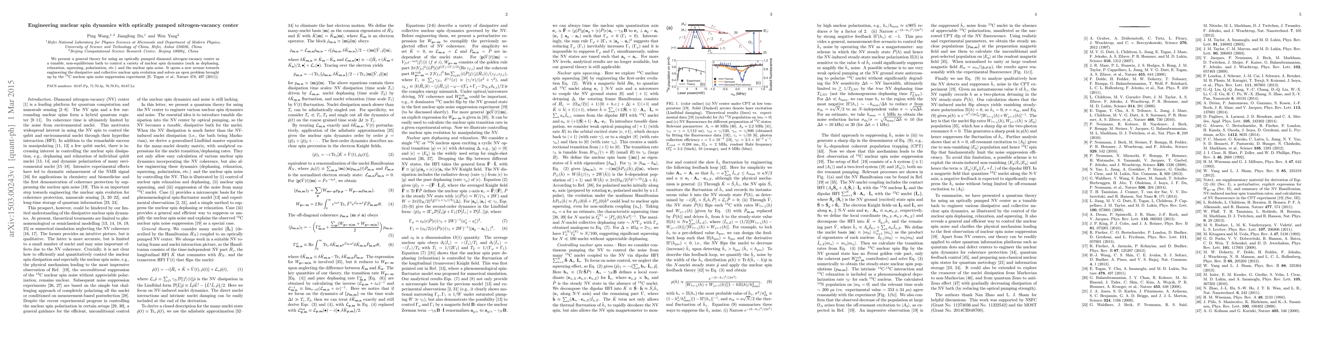 This paper develops a theoretical framework for manipulating nuclear spin dynamics using optically pumped nitrogen-vacancy centers in diamonds, offering a tunable method to control nuclear spin phenomena such as dephasing, relaxation, and noise suppression. This approach addresses the challenge of suppressing $^{13}$C nuclear spin noise, advancing the field of quantum spin engineering.
