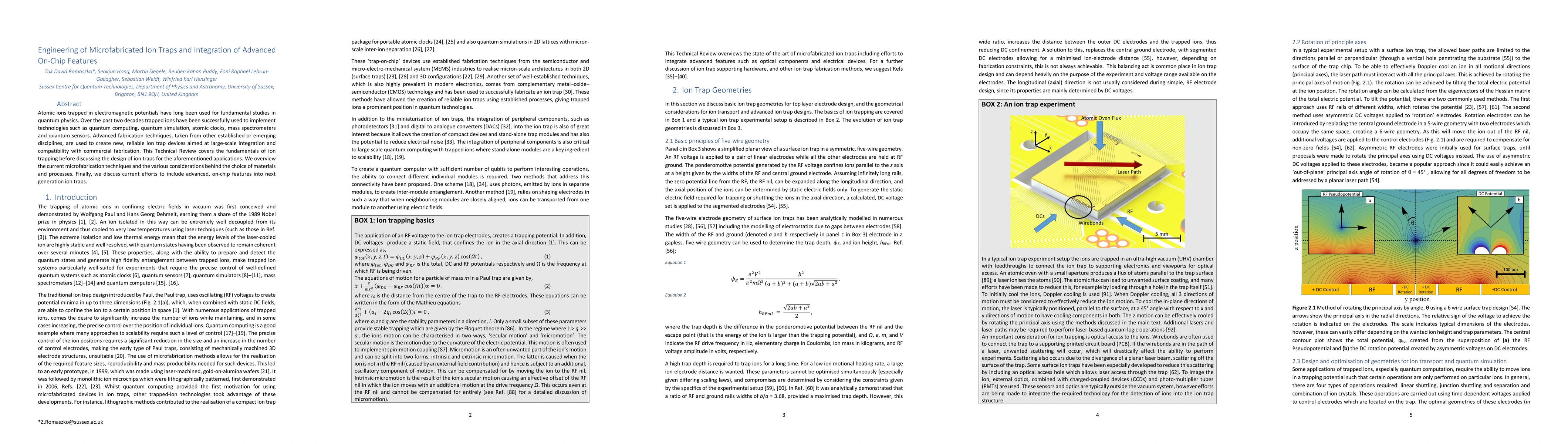 Researchers review advances in ion trap technology for quantum computing, simulation, clocks, mass spectrometers, sensors, and integration of on-chip features.