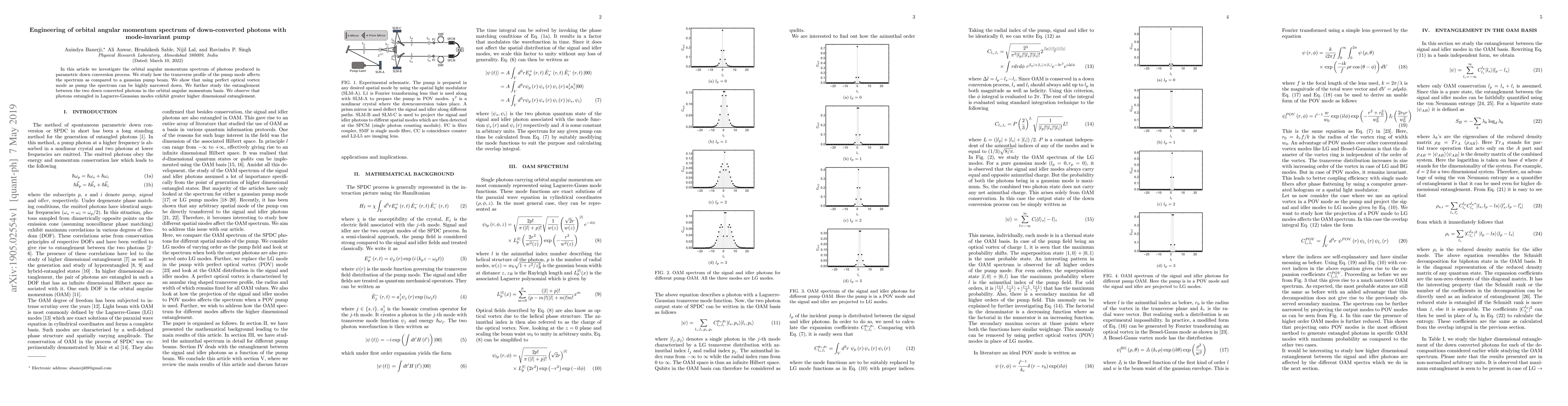This paper explores the orbital angular momentum spectrum of photons generated via parametric down conversion, demonstrating that using a perfect optical vortex mode as pump significantly narrows the spectrum compared to a Gaussian pump beam. It also investigates the entanglement of the down-converted photons, finding greater higher-dimensional entanglement in Laguerre-Gaussian modes.
