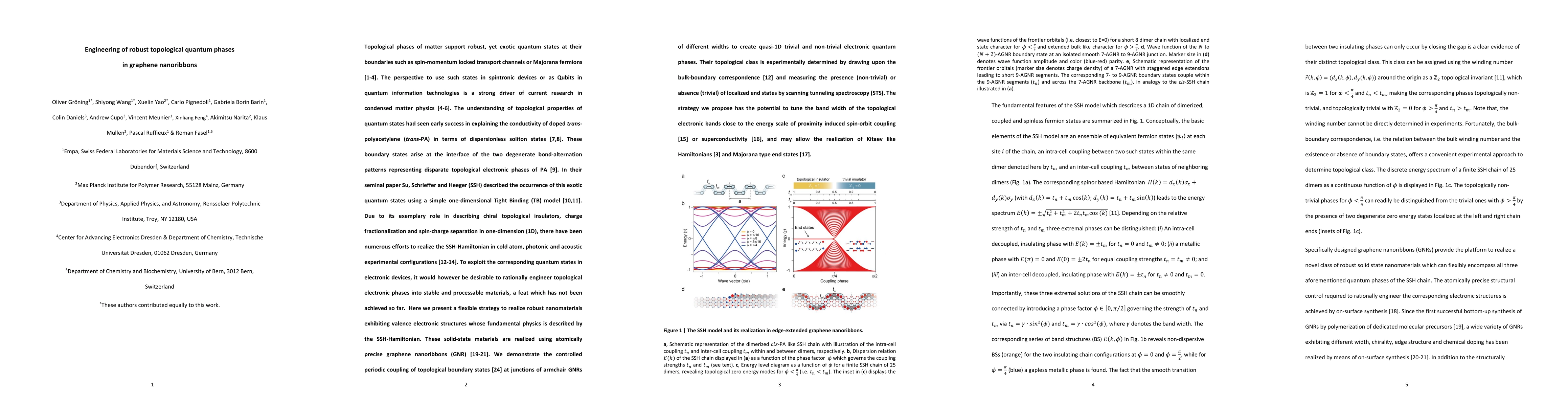 This paper details a method to engineer robust topological quantum phases in graphene nanoribbons using the SSH-Hamiltonian, demonstrating controlled coupling of topological boundary states to create quasi-1D electronic phases. The topological nature is confirmed via scanning tunneling spectroscopy, with potential for realizing Majorana end states.