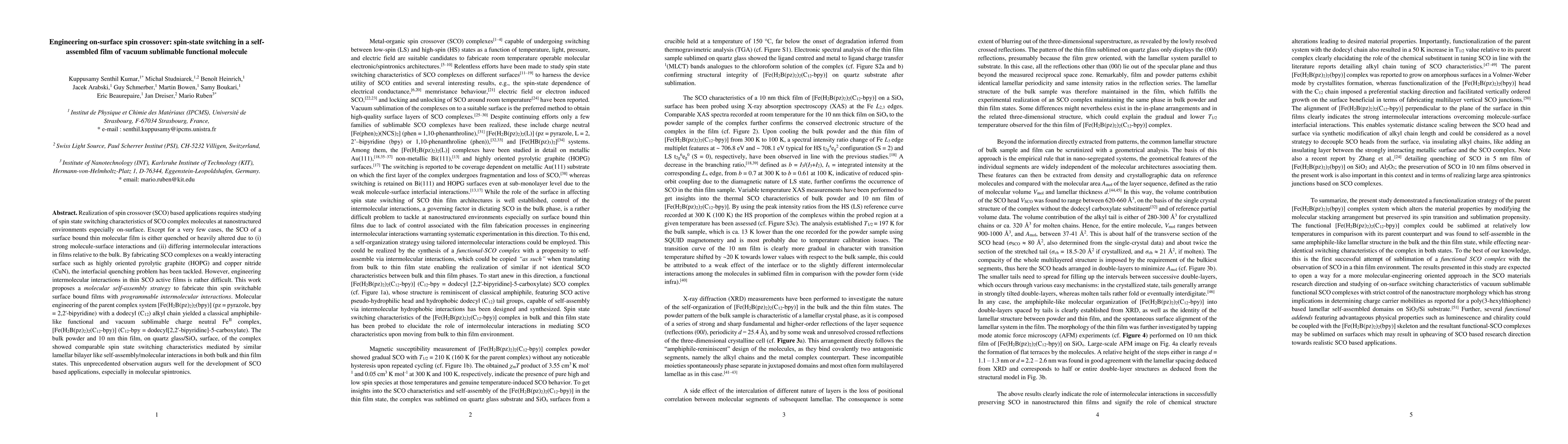 Realization of spin crossover (SCO) based applications requires studying of spin state switching characteristics of SCO complex molecules at nanostructured environments especially on-surface. Except for a very few cases, the SCO of a surface bound thin molecular film is either quenched or heavily altered due to (i) strong molecule-surface interactions and (ii) differing intermolecular interactions in films relative to the bulk. By fabricating SCO complexes on a weakly interacting surface such as highly oriented pyrolytic graphite (HOPG) and copper nitride (CuN), the interfacial quenching problem has been tackled. However, engineering intermolecular interactions in thin SCO active films is rather difficult. This work proposes a molecular self-assembly strategy to fabricate thin spin switchable surface bound films with programmable intermolecular interactions. Molecular engineering of the parent complex system [Fe(H$_{2}$B(pz)$_{2}$)$_{2}$(bpy)] (pz = pyrazole, bpy = 2,2'-bipyridine) with a dodecyl (C$_{12}$) alkyl chain yielded a classical amphiphile-like functional and vacuum sublimable charge neutral Fe$^{\rm II}$ complex, [Fe(H$_{2}$B(pz)$_{2}$)$_{2}$(C$_{12}$-bpy)] (C$_{12}$-bpy = dodecyl[2,2'-bipyridine]-5-carboxylate). The bulk powder and 10 nm thin film, on quartz glass/SiO$_{\rm x}$ surface, of the complex showed comparable spin state switching characteristics mediated by similar lamellar bilayer like self-assembly/molecular interactions in both bulk and thin film states. This unprecedented observation augurs well for the development of SCO based applications, especially in molecular spintronics.