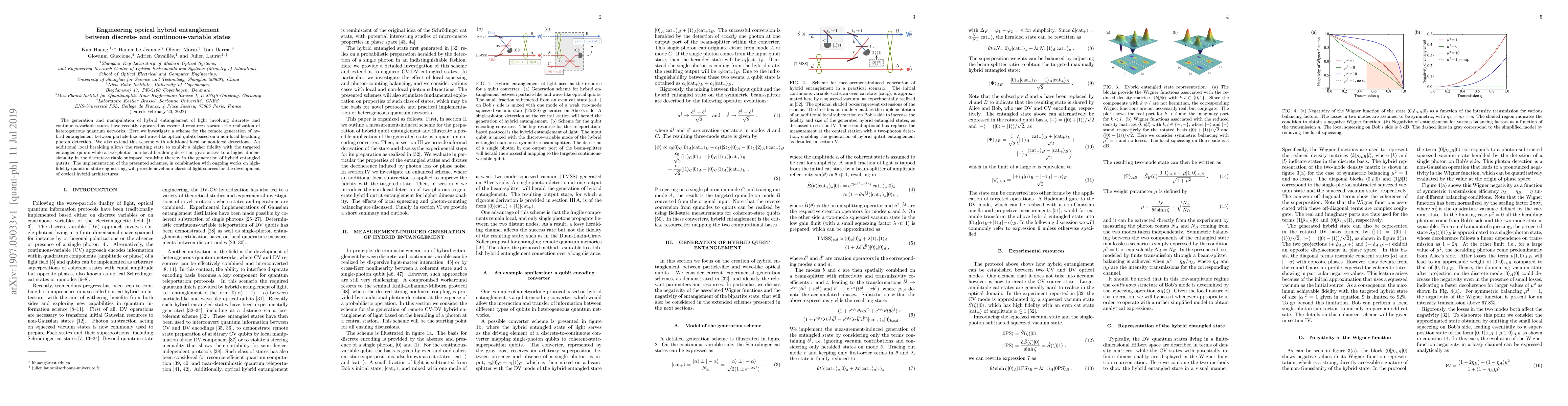This paper proposes a method for generating hybrid entanglement between discrete-variable and continuous-variable optical states using non-local heralding photon detection, enhancing fidelity with local detections and expanding dimensionality with two-photon non-local detections to create hybrid entangled qutrits. The scheme aims to develop novel non-classical light sources for optical quantum networks.