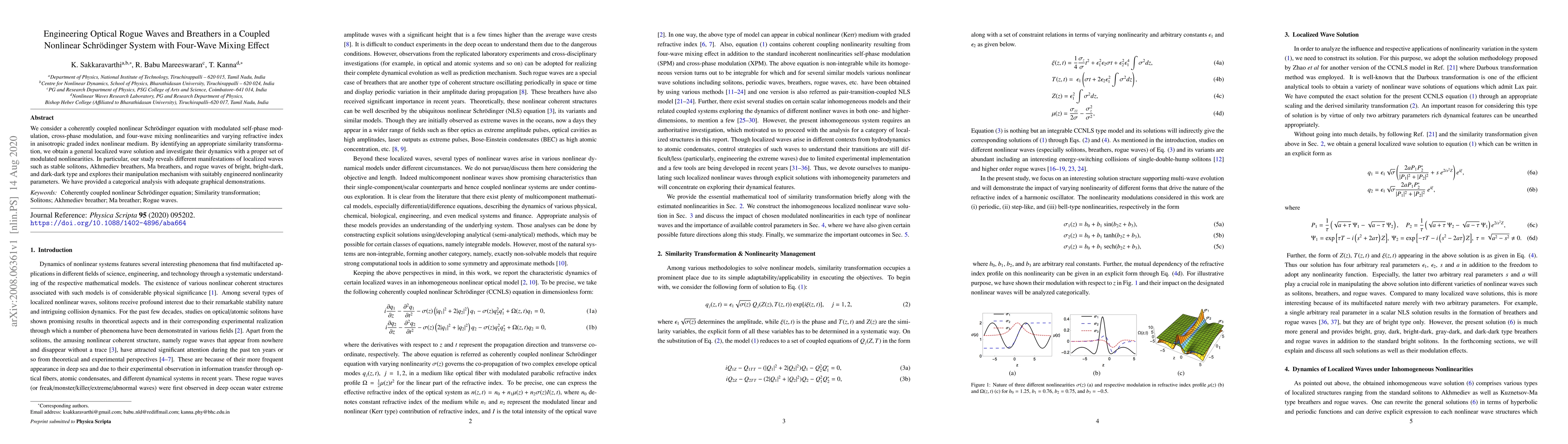 We consider a coherently coupled nonlinear Schr\"odinger equation with modulated self-phase modulation, cross-phase modulation, and four-wave mixing nonlinearities and varying refractive index in anisotropic graded index nonlinear medium. By identifying an appropriate similarity transformation, we obtain a general localized wave solution and investigate their dynamics with a proper set of modulated nonlinearities. In particular, our study reveals different manifestations of localized waves such as stable solitons, Akhmediev breathers, Ma breathers, and rogue waves of bright, bright-dark, and dark-dark type and explores their manipulation mechanism with suitably engineered nonlinearity parameters. We have provided a categorical analysis with adequate graphical demonstrations.