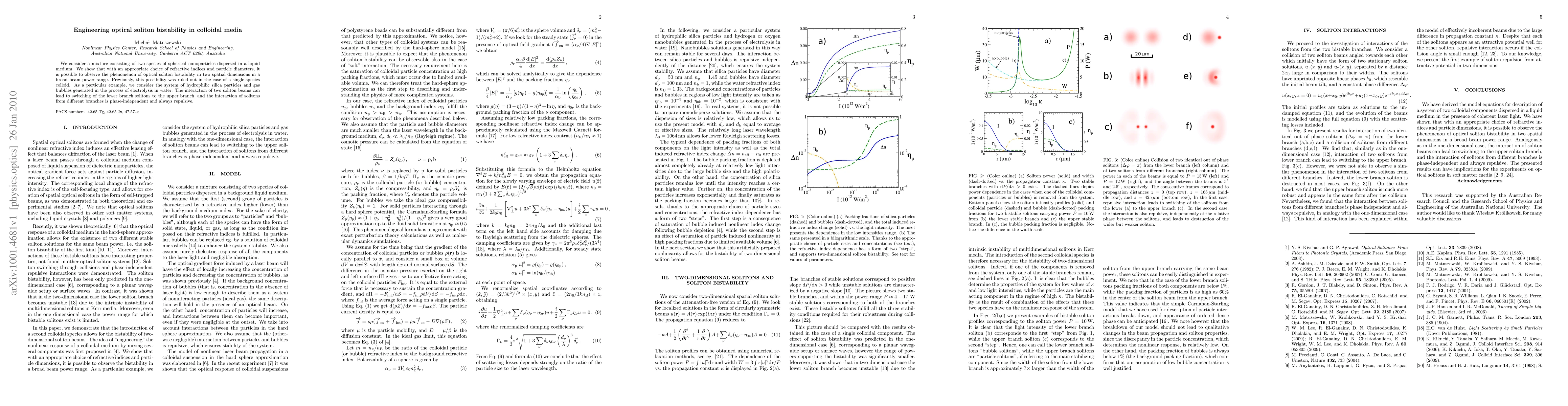 We consider a mixture consisting of two species of spherical nanoparticles dispersed in a liquid medium. We show that with an appropriate choice of refractive indices and particle diameters, it is possible to observe the phenomenon of optical soliton bistability in two spatial dimensions in a broad beam power range. Previously, this possibility was ruled out in the case of a single-species colloid. As a particular example, we consider the system of hydrophilic silica particles and gas bubbles generated in the process of electrolysis in water. The interaction of two soliton beams can lead to switching of the lower branch solitons to the upper branch, and the interaction of solitons from different branches is phase independent and always repulsive.