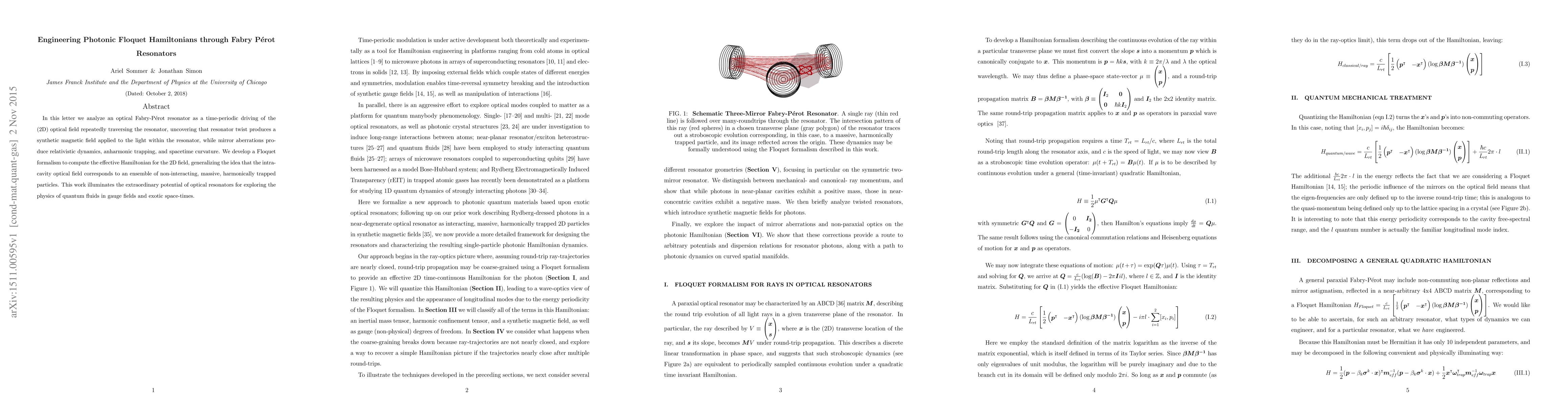 This paper explores the use of Fabry-Pérot resonators to engineer photonic Floquet Hamiltonians, revealing that twist in the resonator generates a synthetic magnetic field and mirror aberrations induce relativistic dynamics and spacetime curvature. The study develops a Floquet formalism to describe the effective Hamiltonian for the optical field, highlighting the potential of optical resonators in studying quantum fluids and exotic spacetimes.
