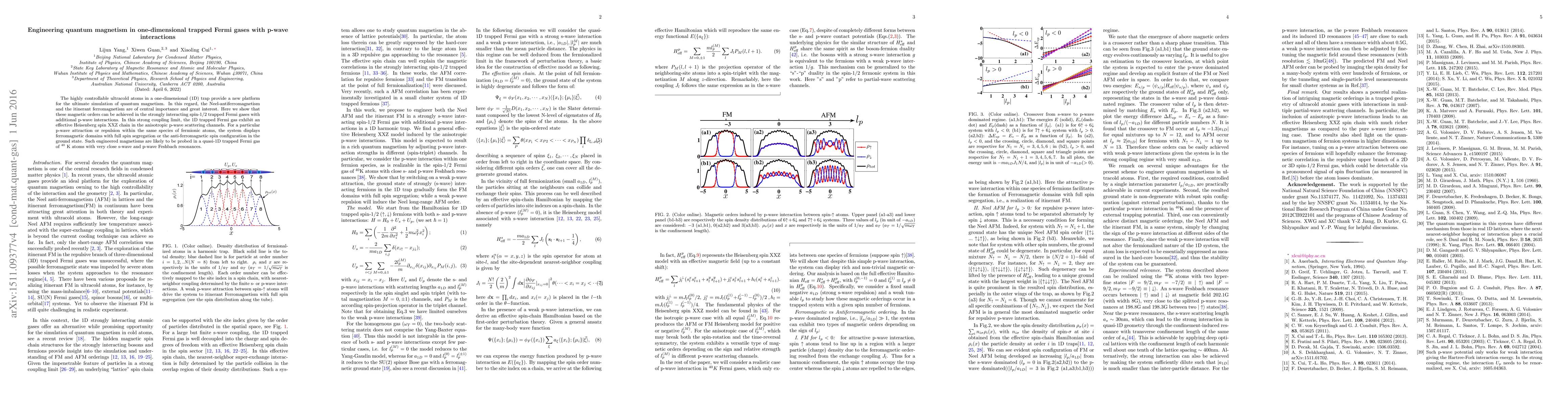 This paper demonstrates how quantum magnetism can be engineered in one-dimensional trapped Fermi gases with p-wave interactions, achieving Neel-antiferromagnetism and itinerant ferromagnetism. The system behaves as an effective Heisenberg spin XXZ chain, displaying ferromagnetic or antiferromagnetic configurations depending on the p-wave interaction strength.