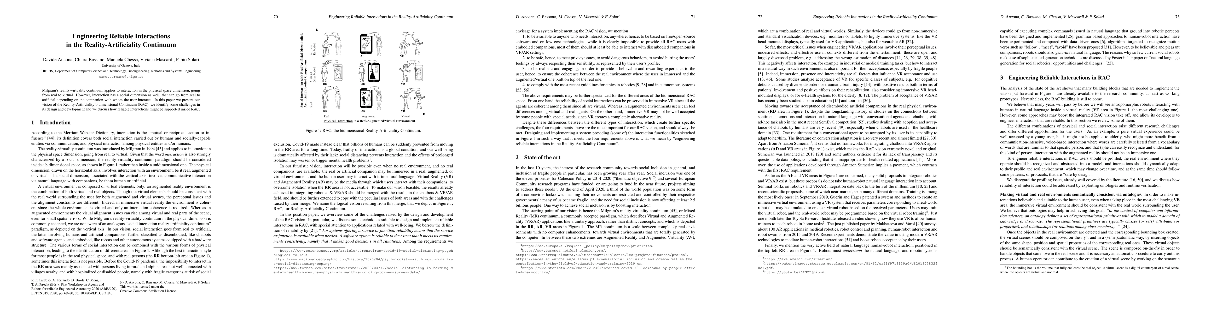 Milgram's reality-virtuality continuum applies to interaction in the physical space dimension, going from real to virtual. However, interaction has a social dimension as well, that can go from real to artificial depending on the companion with whom the user interacts. In this paper we present our vision of the Reality-Artificiality bidimensional Continuum (RAC), we identify some challenges in its design and development and we discuss how reliable interactions might be supported inside RAC.