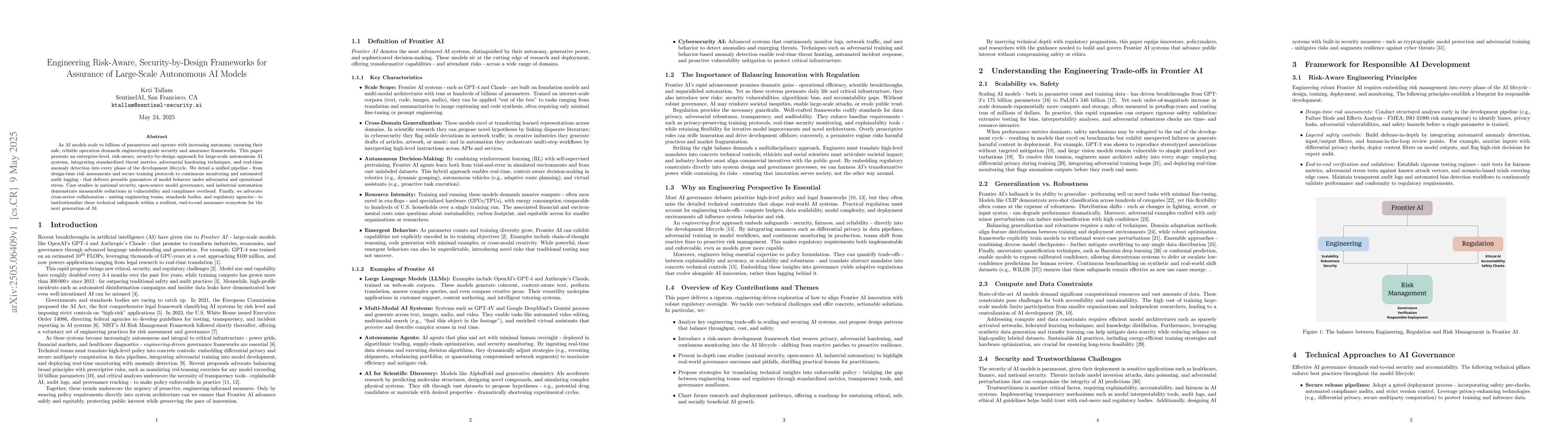 As AI models scale to billions of parameters and operate with increasing autonomy, ensuring their safe, reliable operation demands engineering-grade security and assurance frameworks. This paper presents an enterprise-level, risk-aware, security-by-design approach for large-scale autonomous AI systems, integrating standardized threat metrics, adversarial hardening techniques, and real-time anomaly detection into every phase of the development lifecycle. We detail a unified pipeline - from design-time risk assessments and secure training protocols to continuous monitoring and automated audit logging - that delivers provable guarantees of model behavior under adversarial and operational stress. Case studies in national security, open-source model governance, and industrial automation demonstrate measurable reductions in vulnerability and compliance overhead. Finally, we advocate cross-sector collaboration - uniting engineering teams, standards bodies, and regulatory agencies - to institutionalize these technical safeguards within a resilient, end-to-end assurance ecosystem for the next generation of AI.