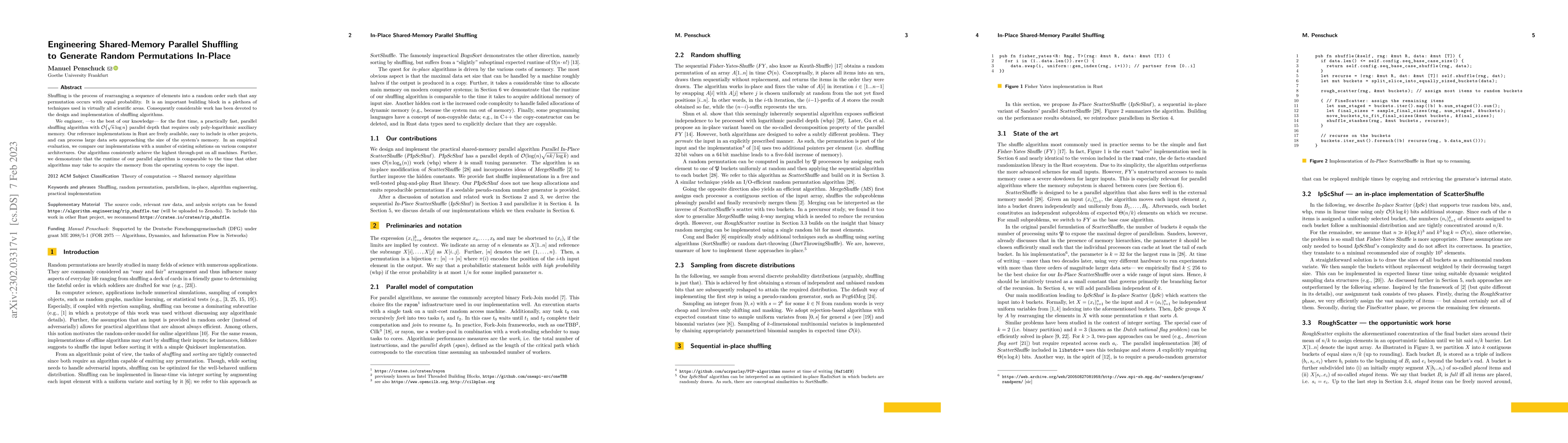 Shuffling is the process of rearranging a sequence of elements into a random order such that any permutation occurs with equal probability. It is an important building block in a plethora of techniques used in virtually all scientific areas. Consequently considerable work has been devoted to the design and implementation of shuffling algorithms. We engineer, -- to the best of our knowledge -- for the first time, a practically fast, parallel shuffling algorithm with $\Oh{\sqrt{n}\log n}$ parallel depth that requires only poly-logarithmic auxiliary memory. Our reference implementations in Rust are freely available, easy to include in other projects, and can process large data sets approaching the size of the system's memory. In an empirical evaluation, we compare our implementations with a number of existing solutions on various computer architectures. Our algorithms consistently achieve the highest through-put on all machines. Further, we demonstrate that the runtime of our parallel algorithm is comparable to the time that other algorithms may take to acquire the memory from the operating system to copy the input.