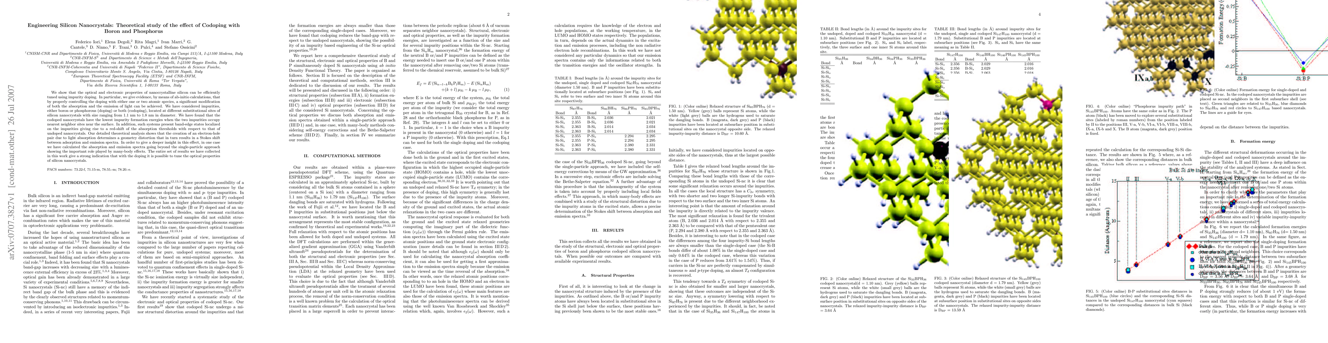 This paper demonstrates that the optical and electronic properties of silicon nanocrystals can be significantly tuned using impurity doping, particularly through codoping with boron and phosphorus. Theoretical calculations reveal that codoping with these elements, especially when they occupy nearest neighbor sites, results in a red-shift in absorption thresholds and a Stokes shift in emission spectra due to light-induced geometry distortions.