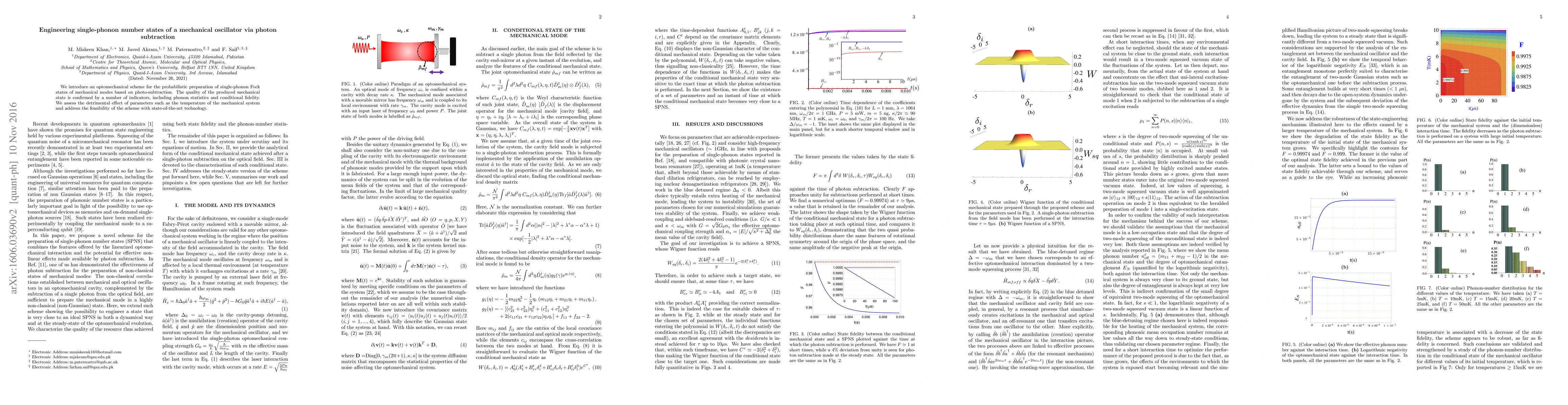 This paper presents an optomechanical scheme for probabilistic generation of single-phonon Fock states in mechanical oscillators through photon subtraction, validated by phonon statistics and conditional fidelity. It also evaluates the impact of mechanical system temperature and assesses the scheme's feasibility with current technology.