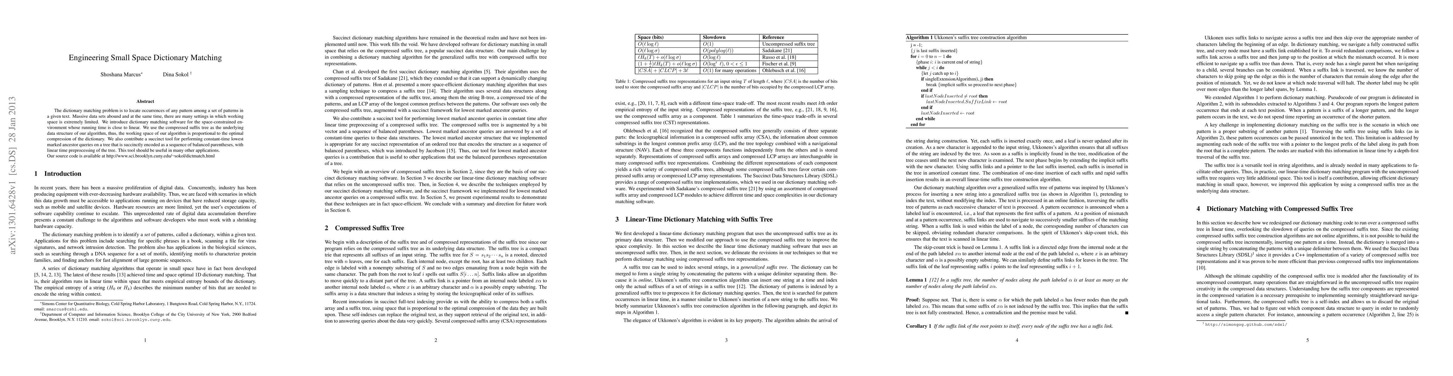 This paper presents a dictionary matching algorithm for space-constrained environments, utilizing a compressed suffix tree to achieve near-linear running time. It also introduces a succinct tool for constant-time lowest marked ancestor queries, which is encoded as balanced parentheses and has linear time preprocessing.