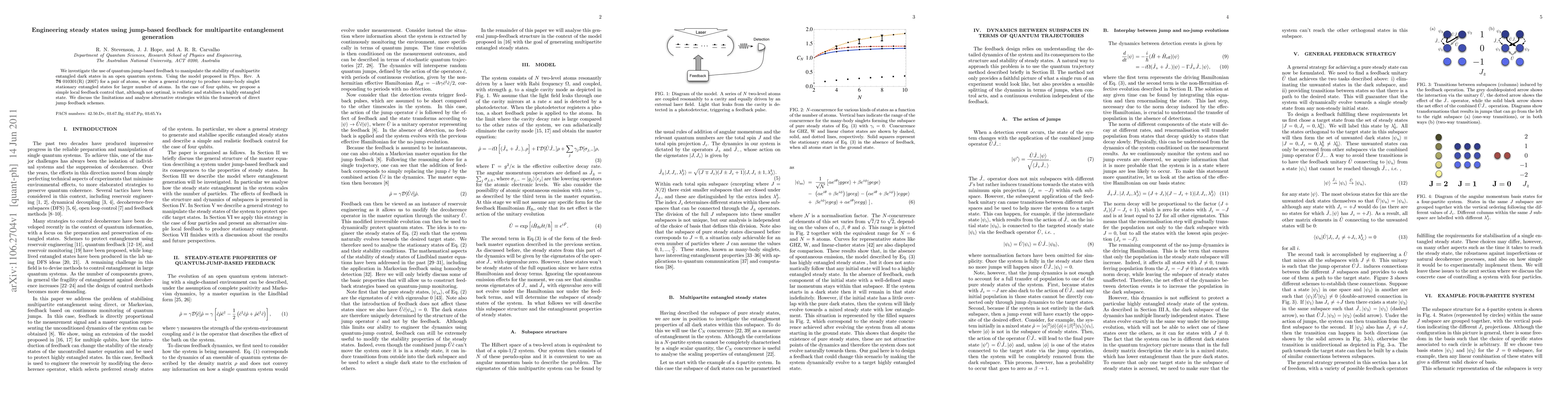 This paper explores quantum-jump-based feedback to stabilize multipartite entangled dark states in open quantum systems, extending a model for two-atom systems to larger groups. It proposes a practical local feedback control for four qubits that stabilizes a highly entangled state, while discussing limitations and alternative strategies.