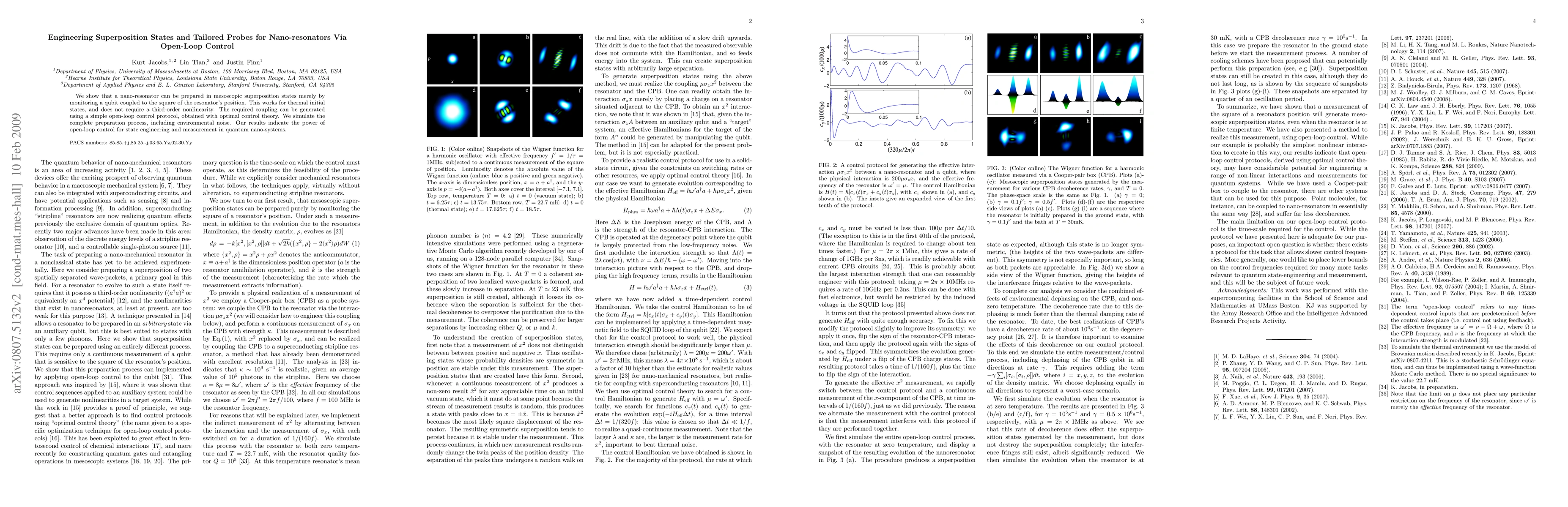 We show that a nano-resonator can be prepared in mesoscopic-superposition states merely by monitoring a qubit coupled to the square of the resonators position. This works for thermal initial states, and does not require a third-order nonlinearity. The required coupling can be generated using a simple open-loop control protocol, obtained with optimal control theory. We simulate the complete preparation process, including environmental noise. Our results indicate the power of open-loop control for state-engineering and measurement in quantum nano-systems.