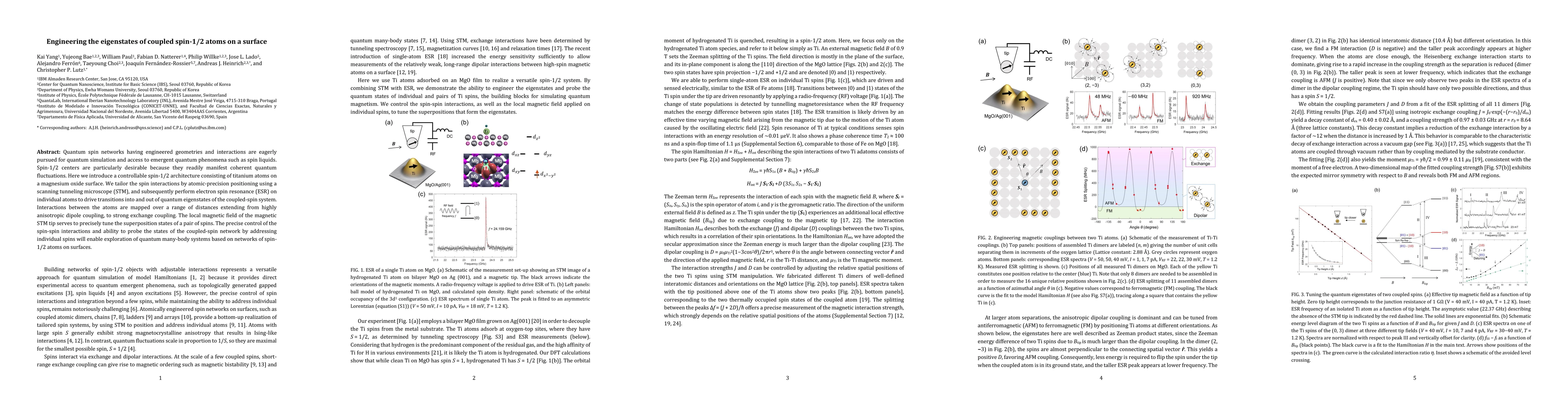 This paper details the creation of a controllable spin-1/2 architecture using titanium atoms on a magnesium oxide surface, where spin interactions are precisely engineered via atomic-precision positioning with an STM. The study explores various coupling mechanisms and uses ESR to probe the quantum eigenstates of the coupled-spin system, paving the way for quantum many-body systems research.