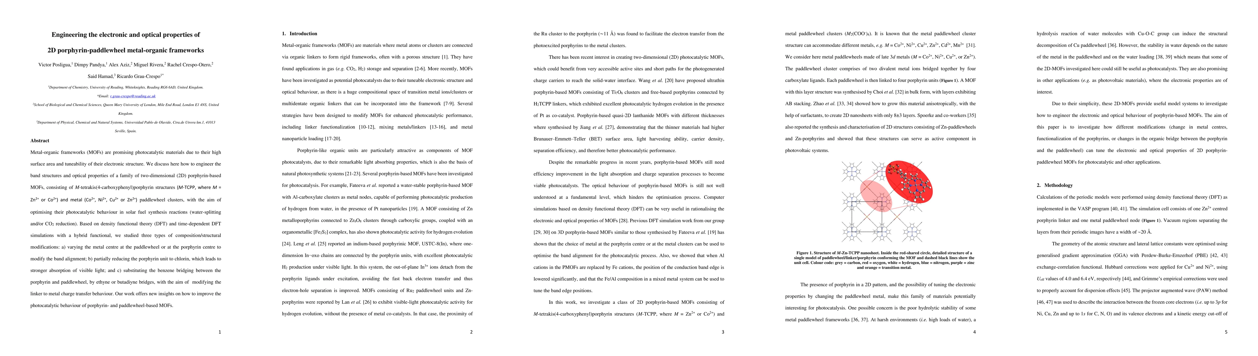 Metal organic frameworks (MOFs) are promising photocatalytic materials due to their high surface area and tuneability of their electronic structure. We discuss here how to engineer the band structures and optical properties of a family of two-dimensional (2D) porphyrin-based MOFs, consisting of M tetrakis(4 carboxyphenyl)porphyrin structures (M TCPP, where M = Zn2+ or Co2+) and metal (Co2+, Ni2+, Cu2+ or Zn2+) paddlewheel clusters, with the aim of optimising their photocatalytic behaviour in solar fuel synthesis reactions (water splitting and/or CO2 reduction). Based on density functional theory (DFT) and time-dependent DFT simulations with a hybrid functional, we studied three types of composition/structural modifications: a) varying the metal centre at the paddlewheel or at the porphyrin centre to modify the band alignment; b) partially reducing the porphyrin unit to chlorin, which leads to stronger absorption of visible light; and c) substituting the benzene bridging between the porphyrin and paddlewheel, by ethyne or butadiyne bridges, with the aim of modifying the linker to metal charge transfer behaviour. Our work offers new insights on how to improve the photocatalytic behaviour of porphyrin- and paddlewheel-based MOFs.
