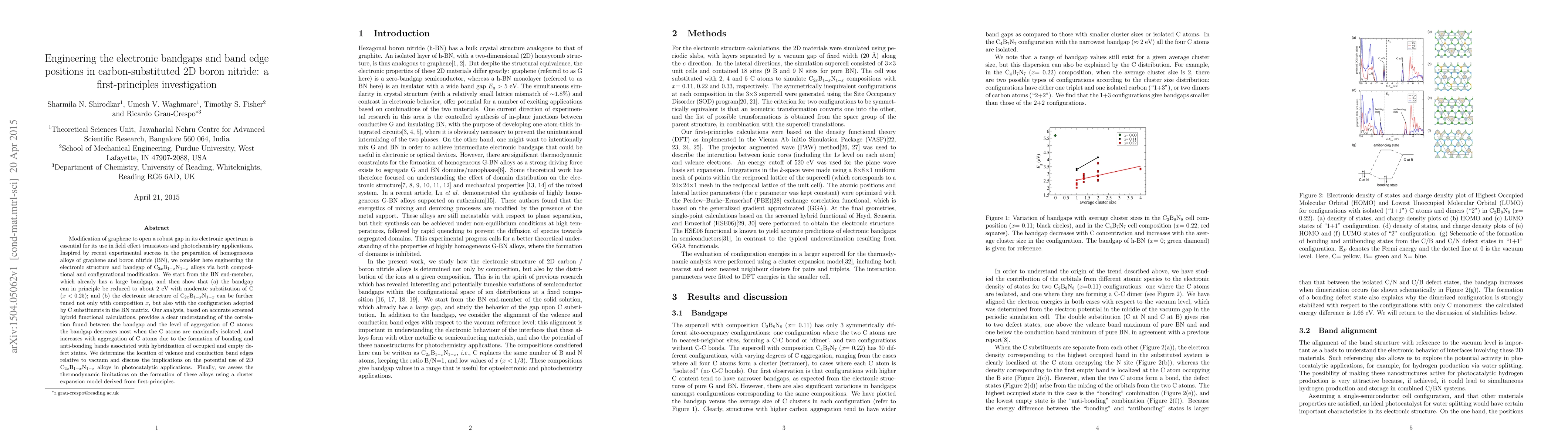 This study investigates the electronic bandgaps and band edge positions of carbon-substituted 2D boron nitride (C$_{2x}$B$_{1-x}$N$_{1-x}$) alloys using first-principles calculations. The research demonstrates that the bandgap can be reduced to about 2 eV with moderate carbon substitution and that the electronic structure can be tuned further by the configuration of carbon atoms, with implications for photocatalytic applications.