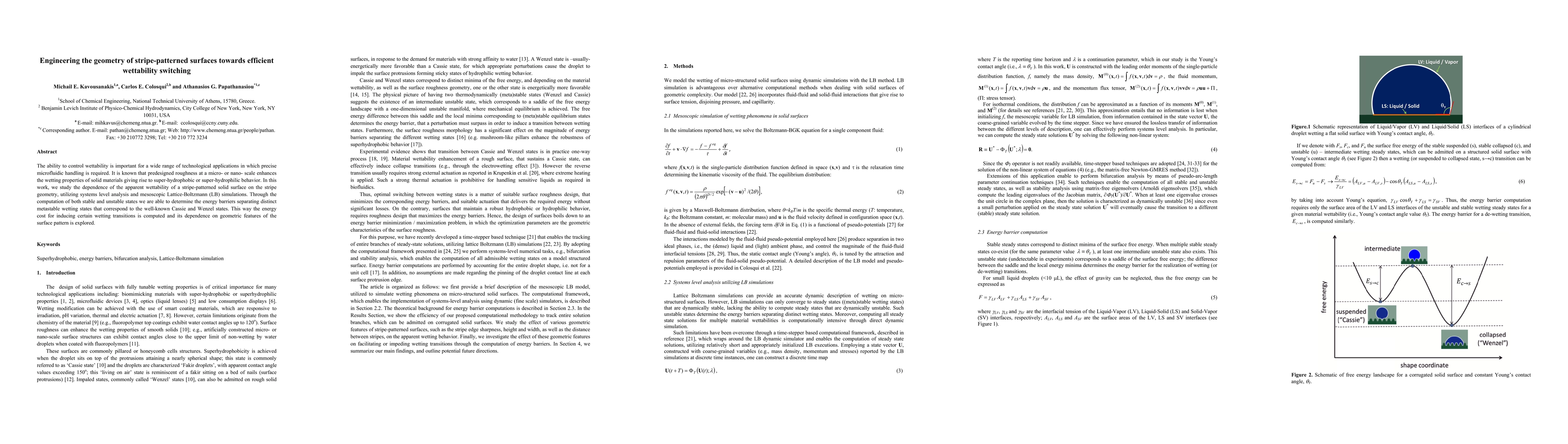 The ability to control wettability is important for a wide range of technological applications in which precise microfluidic handling is required. It is known that predesigned roughness at a micro- or nano- scale enhances the wetting properties of solid materials giving rise to super-hydrophobic or super-hydrophilic behavior. In this work, we study the dependence of the apparent wettability of a stripe-patterned solid surface on the stripe geometry, utilizing systems level analysis and mesoscopic Lattice-Boltzmann (LB) simulations. Through the computation of both stable and unstable states we are able to determine the energy barriers separating distinct metastable wetting states that correspond to the well-known Cassie and Wenzel states. This way the energy cost for inducing certain wetting transitions is computed and its dependence on geometric features of the surface pattern is explored.