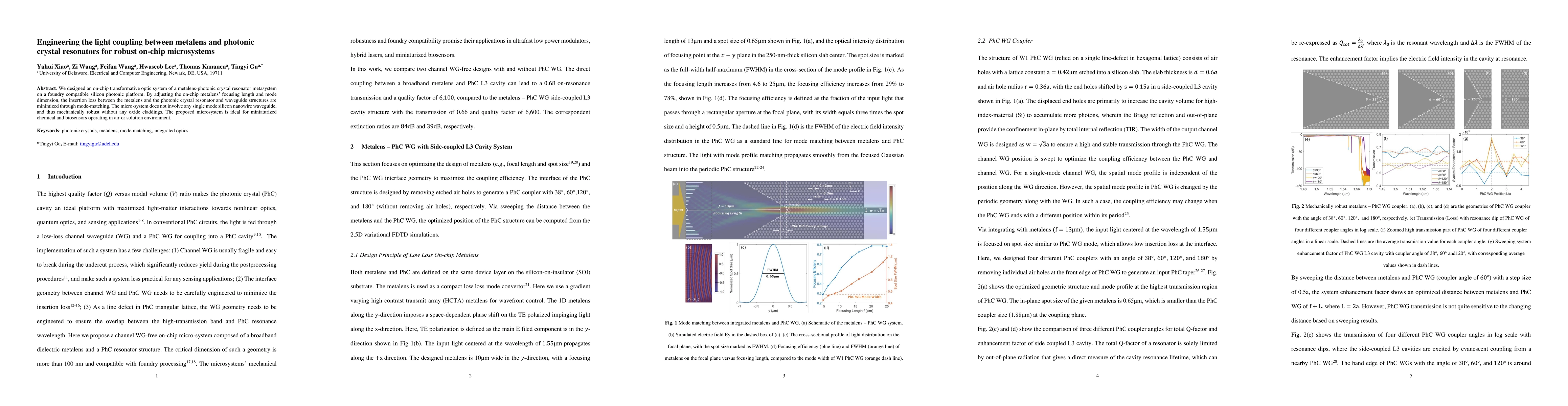 This paper presents a novel on-chip optical system combining a metalens with photonic crystal resonators on a silicon photonic platform, optimizing light coupling through mode-matching. The design enhances mechanical robustness and minimizes insertion loss, making it suitable for miniaturized chemical and biosensors.