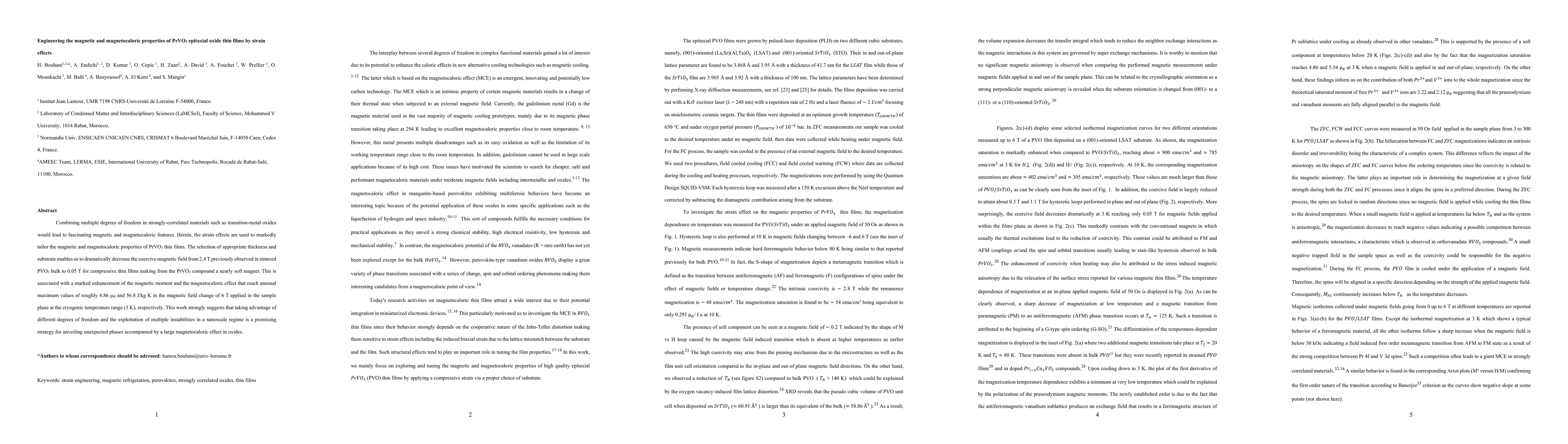 Combining multiple degrees of freedom in strongly-correlated materials such as transition-metal oxides would lead to fascinating magnetic and magnetocaloric features. Herein, the strain effects are used to markedly tailor the magnetic and magnetocaloric properties of PrVO3 thin films. The selection of appropriate thickness and substrate enables us to dramatically decrease the coercive magnetic field from 2.4 T previously observed in sintered PVO3 bulk to 0.05 T for compressive thin films making from the PrVO3 compound a nearly soft magnet. This is associated with a marked enhancement of the magnetic moment and the magnetocaloric effect that reach unusual maximum values of roughly 4.86 uB and 56.8 J/kg K in the magnetic field change of 6 T applied in the sample plane at the cryogenic temperature range (3 K), respectively. This work strongly suggests that taking advantage of different degrees of freedom and the exploitation of multiple instabilities in a nanoscale regime is a promising strategy for unveiling unexpected phases accompanied by a large magnetocaloric effect in oxides.
