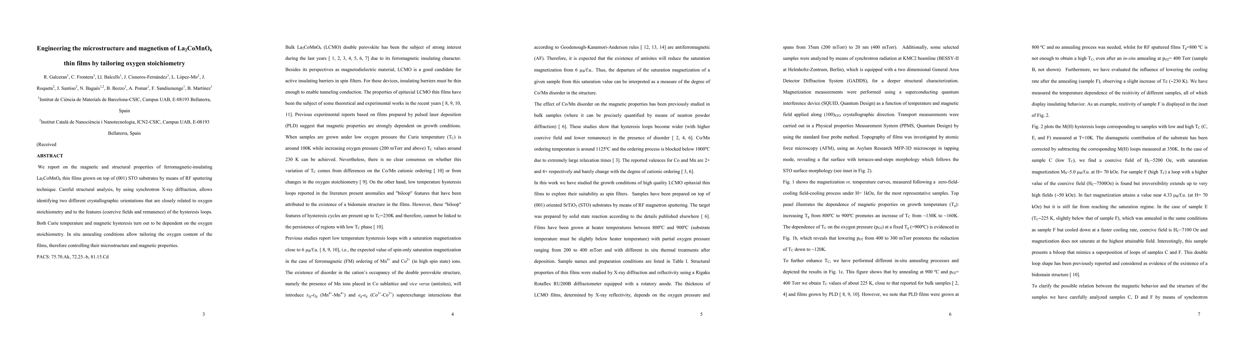 This study investigates the magnetic and structural properties of La$_2$CoMnO$_6$ thin films, revealing that their Curie temperature and magnetic hysteresis are influenced by oxygen stoichiometry. Tailoring oxygen content through in situ annealing alters the films' microstructure and magnetic features.