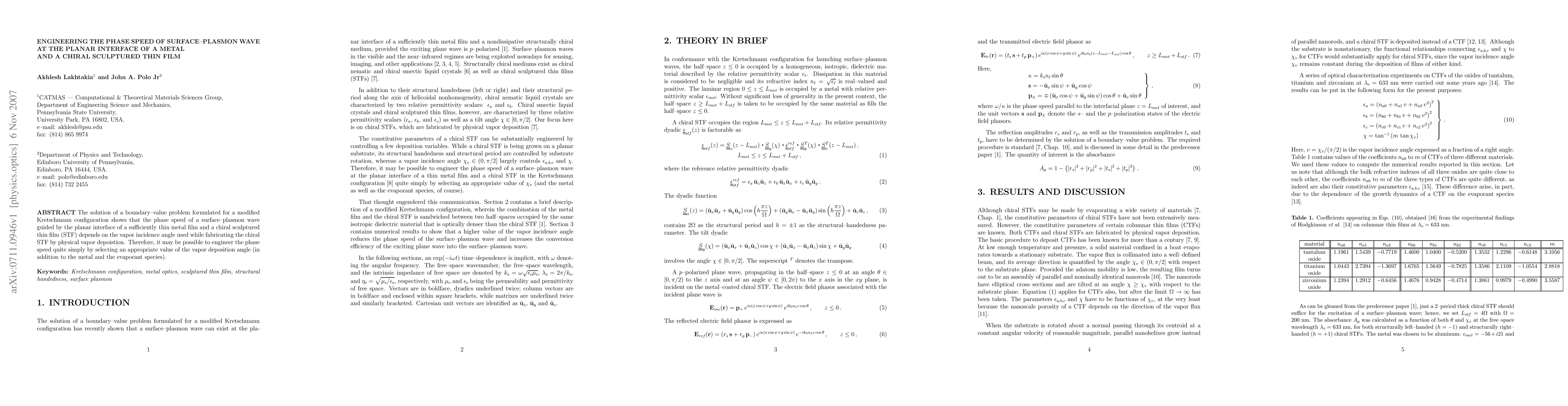 The solution of a boundary-value problem formulated for a modified Kretschmann configuration shows that the phase speed of a surface-plasmon wave guided by the planar interface of a sufficiently thin metal film and a chiral sculptured thin film (STF) depends on the vapor incidence angle used while fabricating the chiral STF by physical vapor depoistion. Therefore, it may be possible to engineer the phase speed quite simply by selecting an appropriate value of the vapor deposition angle (in addition to the metal and the evaporant species).