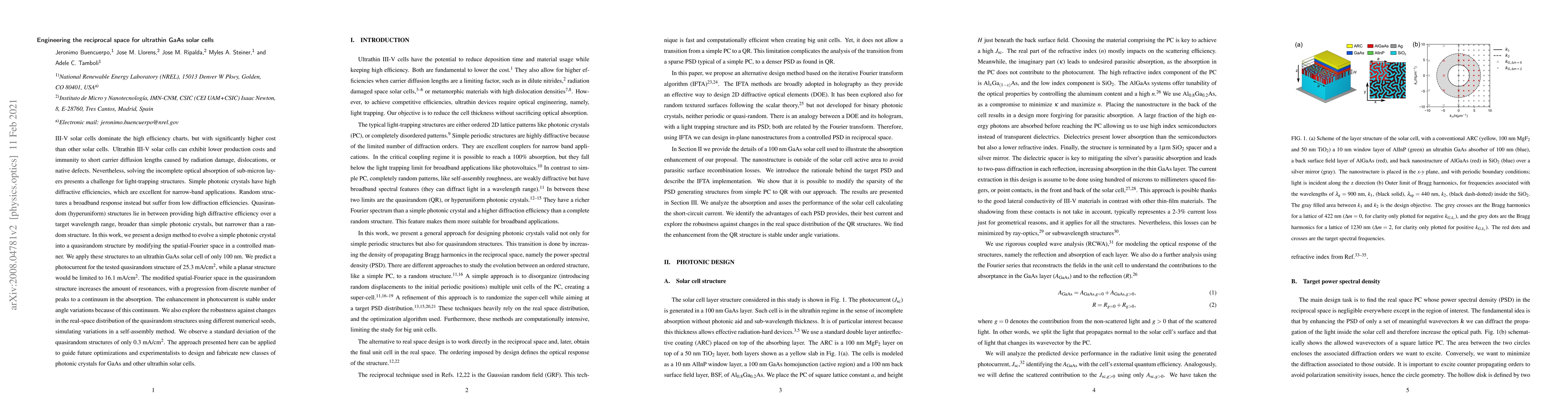 III-V solar cells dominate the high efficiency charts, but with significantly higher cost than other solar cells. Ultrathin III-V solar cells can exhibit lower production costs and immunity to short carrier diffusion lengths caused by radiation damage, dislocations, or native defects. Nevertheless, solving the incomplete optical absorption of sub-micron layers presents a challenge for light-trapping structures. Simple photonic crystals have high diffractive efficiencies, which are excellent for narrow-band applications. Random structures a broadband response instead but suffer from low diffraction efficiencies. Quasirandom (hyperuniform) structures lie in between providing high diffractive efficiency over a target wavelength range, broader than simple photonic crystals, but narrower than a random structure. In this work, we present a design method to evolve a simple photonic crystal into a quasirandom structure by modifying the spatial-Fourier space in a controlled manner. We apply these structures to an ultrathin GaAs solar cell of only 100 nm. We predict a photocurrent for the tested quasirandom structure of 25.3 mA/cm$^2$, while a planar structure would be limited to 16.1 mA/cm$^2$. The modified spatial-Fourier space in the quasirandom structure increases the amount of resonances, with a progression from discrete number of peaks to a continuum in the absorption. The enhancement in photocurrent is stable under angle variations because of this continuum. We also explore the robustness against changes in the real-space distribution of the quasirandom structures using different numerical seeds, simulating variations in a self-assembly method.