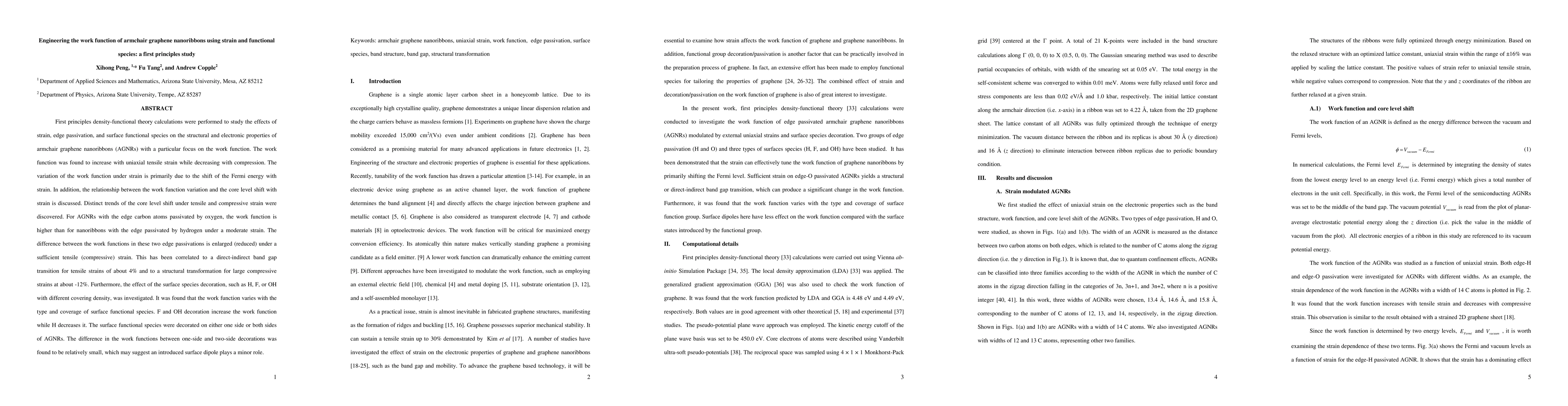 First principles density-functional theory calculations were performed to study the effects of strain, edge passivation, and surface functional species on the structural and electronic properties of armchair graphene nanoribbons (AGNRs) with a particular focus on the work function. The work function was found to increase with uniaxial tensile strain while decreasing with compression. The variation of the work function under strain is primarily due to the shift of the Fermi energy with strain. In addition, the relationship between the work function variation and the core level shift with strain is discussed. Distinct trends of the core level shift under tensile and compressive strain were discovered. For AGNRs with the edge carbon atoms passivated by oxygen, the work function is higher than for nanoribbons with the edge passivated by hydrogen under a moderate strain. The difference between the work functions in these two edge passivations is enlarged (reduced) under a sufficient tensile (compressive) strain. This has been correlated to a direct-indirect band gap transition for tensile strains of about 4% and to a structural transformation for large compressive strains at about -12%. Furthermore, the effect of the surface species decoration, such as H, F, or OH with different covering density, was investigated. It was found that the work function varies with the type and coverage of surface functional species. F and OH decoration increase the work function while H decreases it. The surface functional species were decorated on either one side or both sides of AGNRs. The difference in the work functions between one-side and two-side decorations was found to be relatively small, which may suggest an introduced surface dipole plays a minor role.