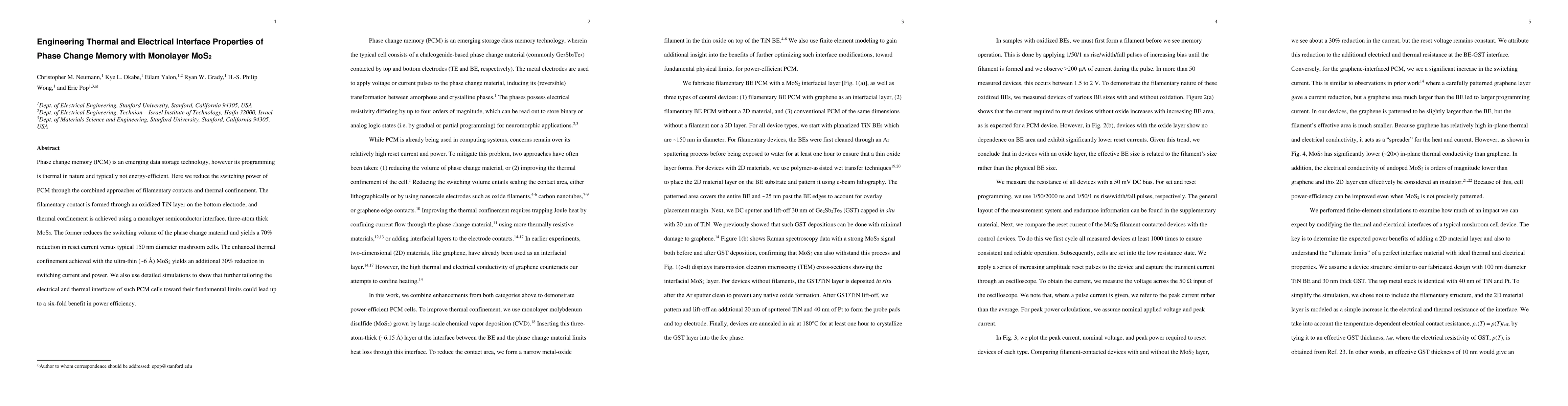 This paper explores methods to enhance the energy efficiency of phase change memory (PCM) by reducing its switching power through filamentary contacts and thermal confinement using a monolayer MoS2 interface, achieving a 70% reduction in reset current and an additional 30% reduction in switching current and power. Further optimization of the interfaces could potentially yield a six-fold improvement in power efficiency.