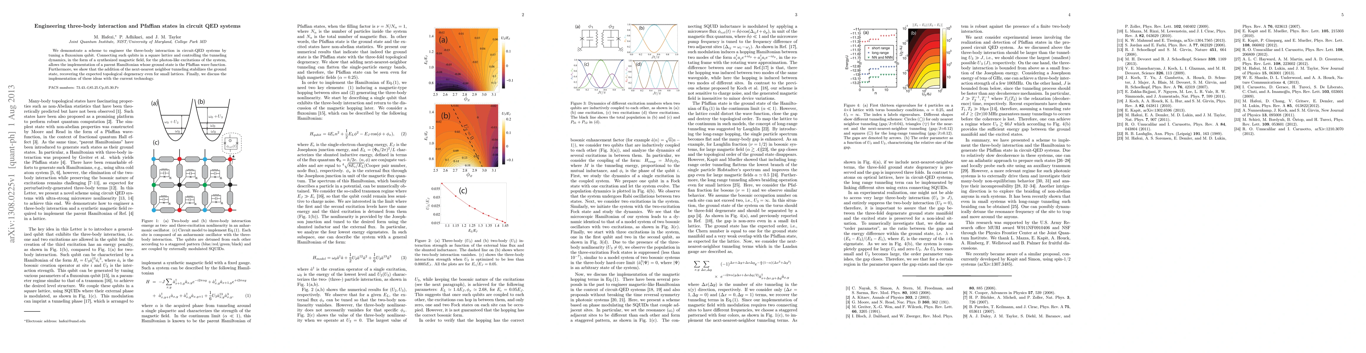 We demonstrate a scheme to engineer the three-body interaction in circuit-QED systems by tuning a fluxonium qubit. Connecting such qubits in a square lattice and controlling the tunneling dynamics, in the form of a synthesized magnetic field, for the photon-like excitations of the system, allows the implementation of a parent Hamiltonian whose ground state is the Pfaffian wave function. Furthermore, we show that the addition of the next-nearest neighbor tunneling stabilizes the ground state, recovering the expected topological degeneracy even for small lattices. Finally, we discuss the implementation of these ideas with the current technology.