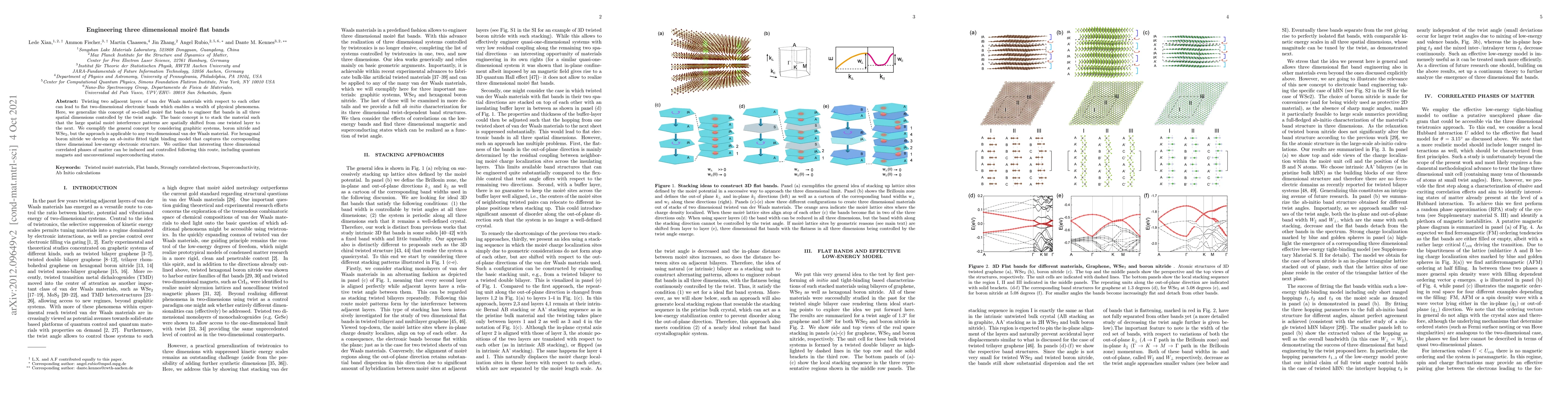 This paper proposes a method to engineer three-dimensional moiré flat bands by stacking multiple twisted layers of two-dimensional van der Waals materials in a predefined pattern, enabling control over electronic properties in all three spatial dimensions. The approach is demonstrated using graphitic systems, boron nitride, and WSe$_2$, suggesting potential for inducing novel correlated phases such as quantum magnets and unconventional superconductors.