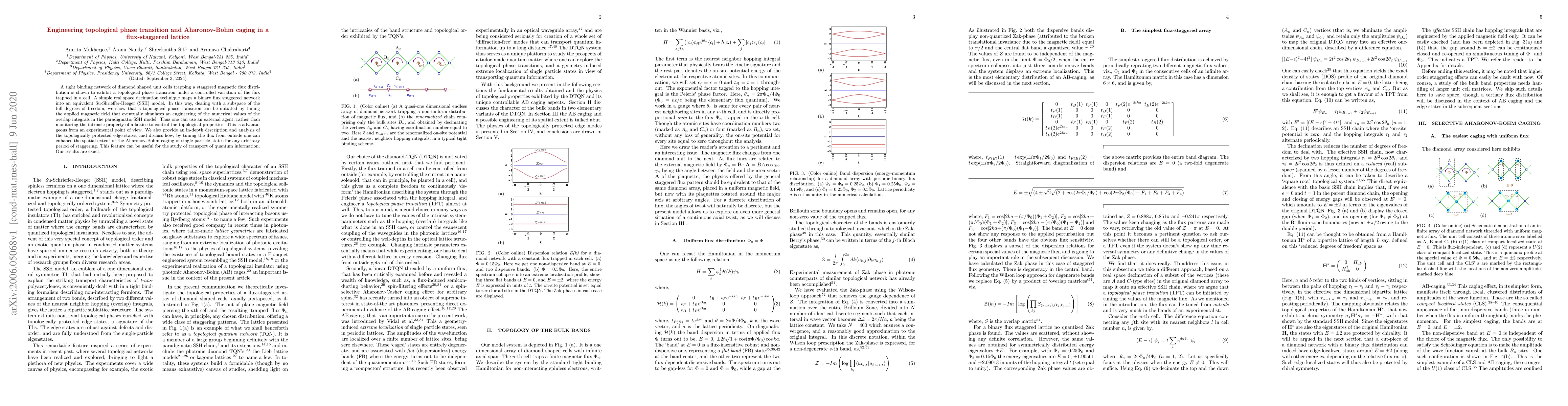 A tight binding network of diamond shaped unit cells trapping a staggered magnetic flux distribution is shown to exhibit a topological phase transition under a controlled variation of the flux trapped in a cell. A simple real space decimation technique maps a binary flux staggered network into an equivalent Su-Shrieffer-Heeger (SSH) model. In this way, dealing with a subspace of the full degrees of freedom, we show that a topological phase transition can be initiated by tuning the applied magnetic field that eventually simulates an engineering of the numerical values of the overlap integrals in the paradigmatic SSH model. Thus one can use an external agent, rather than monitoring the intrinsic property of a lattice to control the topological properties. This is advantageous from an experimental point of view. We also provide an in-depth description and analysis of the topologically protected edge states, and discuss how, by tuning the flux from outside one can enhance the spatial extent of the Aharonov-Bohm caging of single particle states for any arbitrary period of staggering. This feature can be useful for the study of transport of quantum information. Our results are exact.