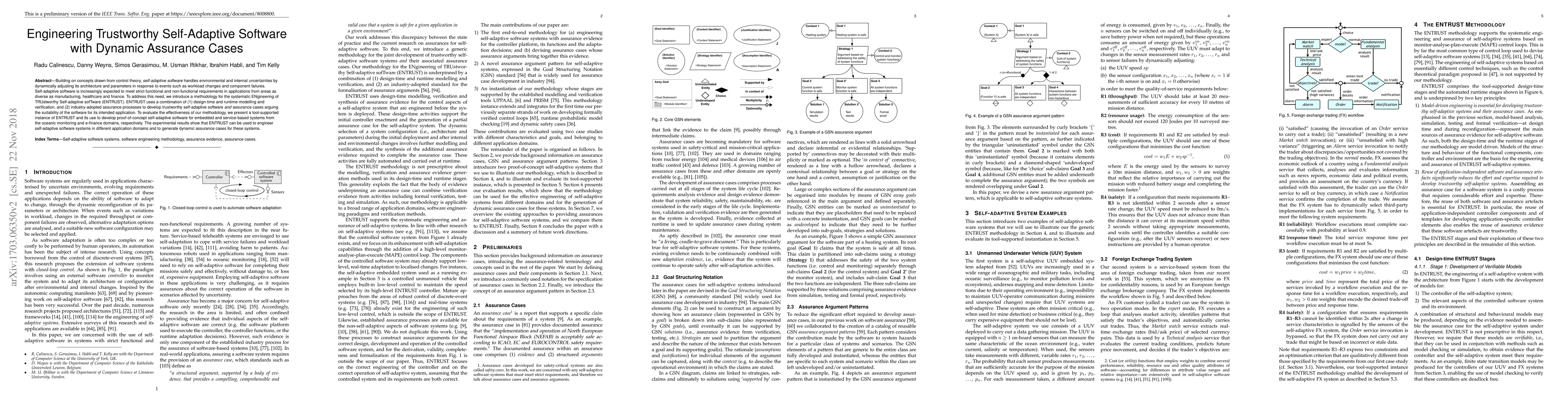 The paper introduces ENTRUST, a methodology for engineering trustworthy self-adaptive software using design-time and runtime verification, and industry assurance processes. Experimental results demonstrate ENTRUST's effectiveness in developing self-adaptive software for oceanic monitoring and e-finance, generating dynamic assurance cases.