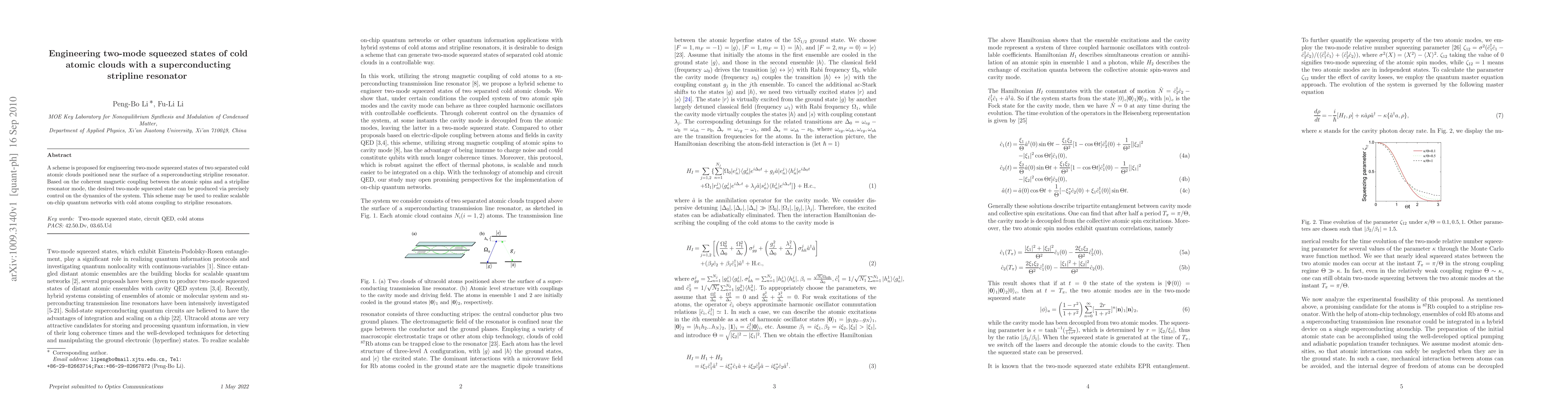 Summary: The paper proposes a method to generate two-mode squeezed states using cold atomic clouds near a superconducting stripline resonator, leveraging coherent magnetic coupling for precise control, potentially enabling scalable on-chip quantum networks with atomic-resonator interactions.
